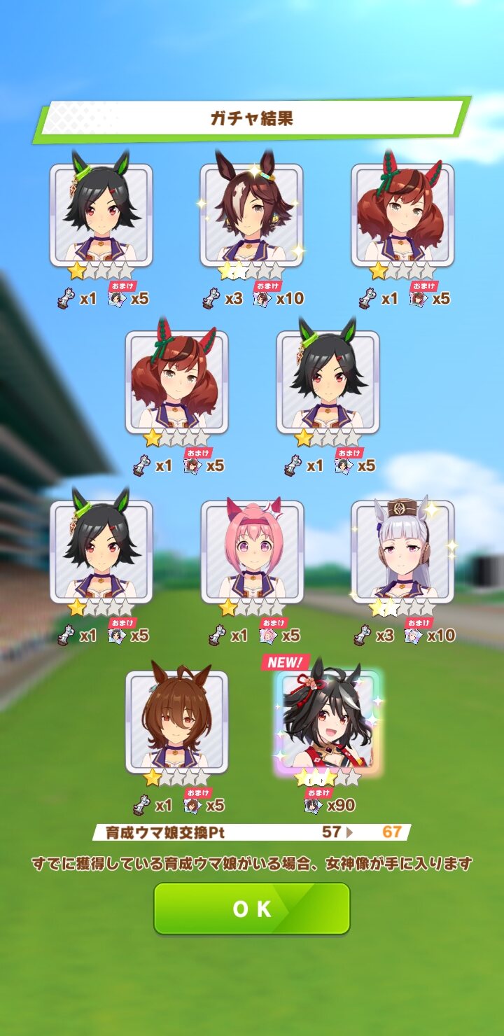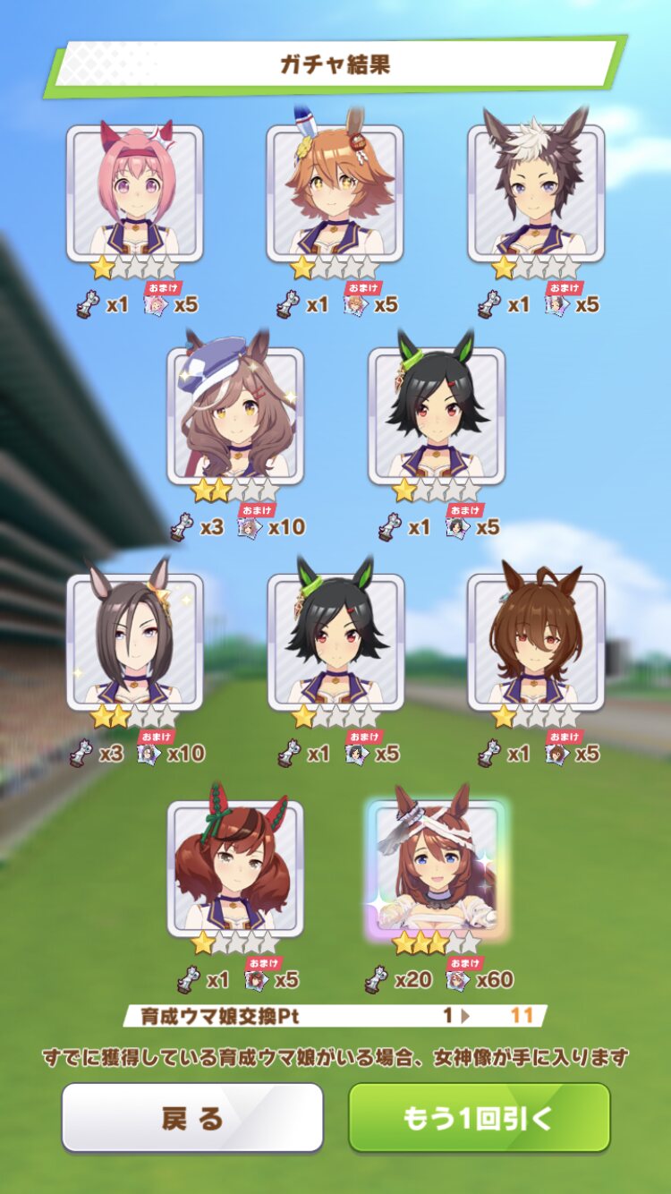 サポカ無料ガチャの総合結果はスズカ、タマモ(スタミナ)、パーマー、チケゾーと初期実装の未入手が4人でしたね。使うかは分かりません。