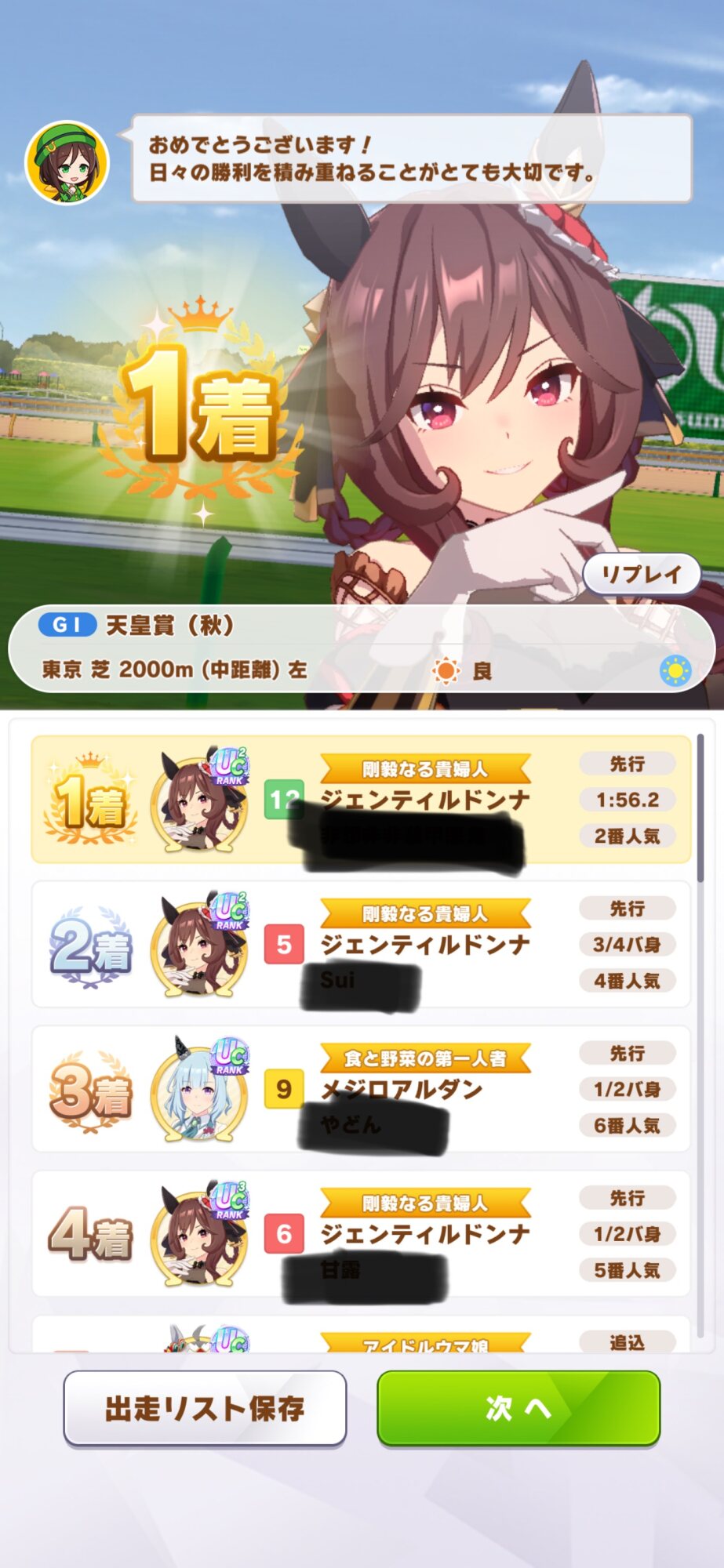 6着!最高着順2着!まあ勝率6割り切ってたチャンミとしては頑張ったな!