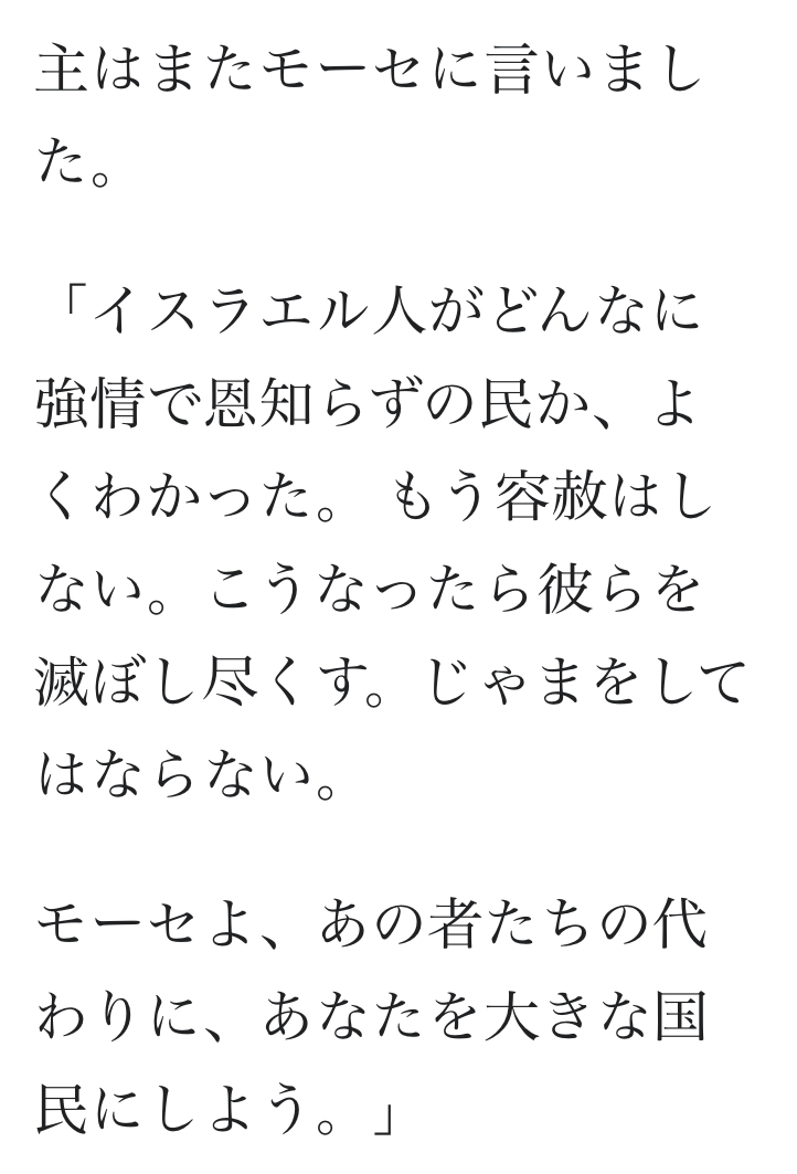 よしそれじゃあ企画を変えてこれからはモーセだけがイスラエルの民と言うことにしよう 他は皆殺しにするのん」