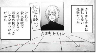 読者はメタ的な視点と見方で「カミキが殺人に走る奴を見定めてわざとそういう方向に持っていけるようトーク力で誘導したんだな」ってわかるけど、だとしてもやはり雑談レベルのトークで殺人に走るのはカミキより実行犯の方が狂ってるとしか思えんよ