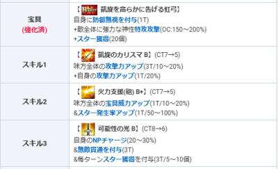 無敵貫通・まだまだ少なめな防御無視・カリスマ・宝具バフ・OCで上がる特攻といい線行ってるんだが、バフが1Tなのがなぁ…自身カリスマか宝具バフどっちか3T欲しい
