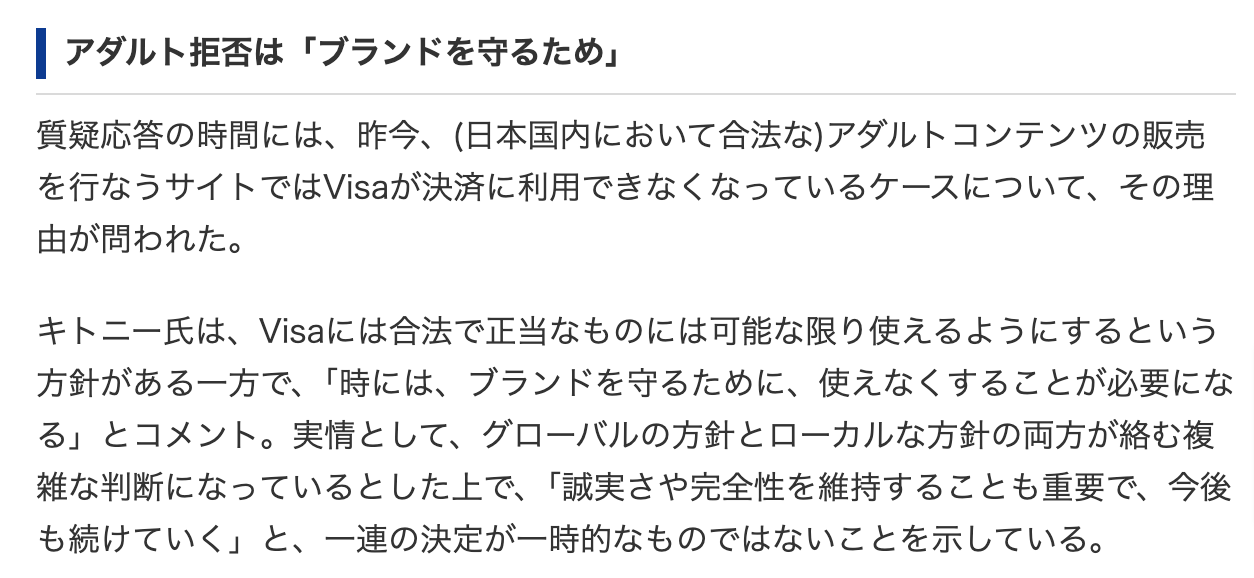 VISA本社としては法的に問題無いならOKという判断を出しているんだぜ