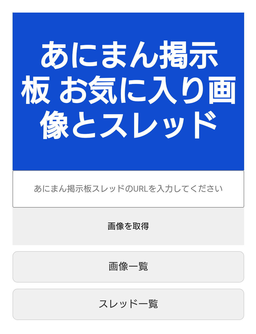 機能1 あにまん掲示板のスレッドURLを入力して画像を取得ボタンを押すとスレッド内の画像が一覧で表示される
