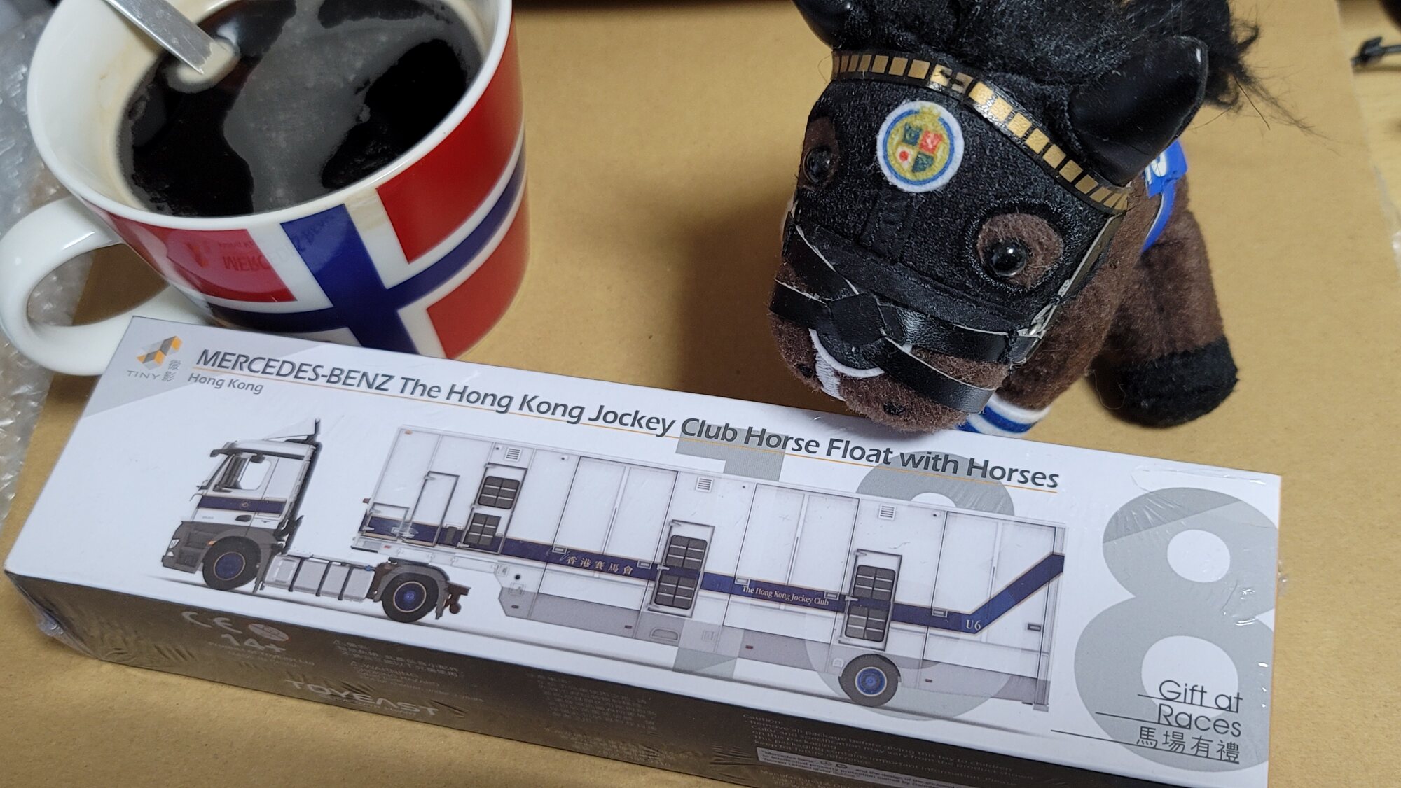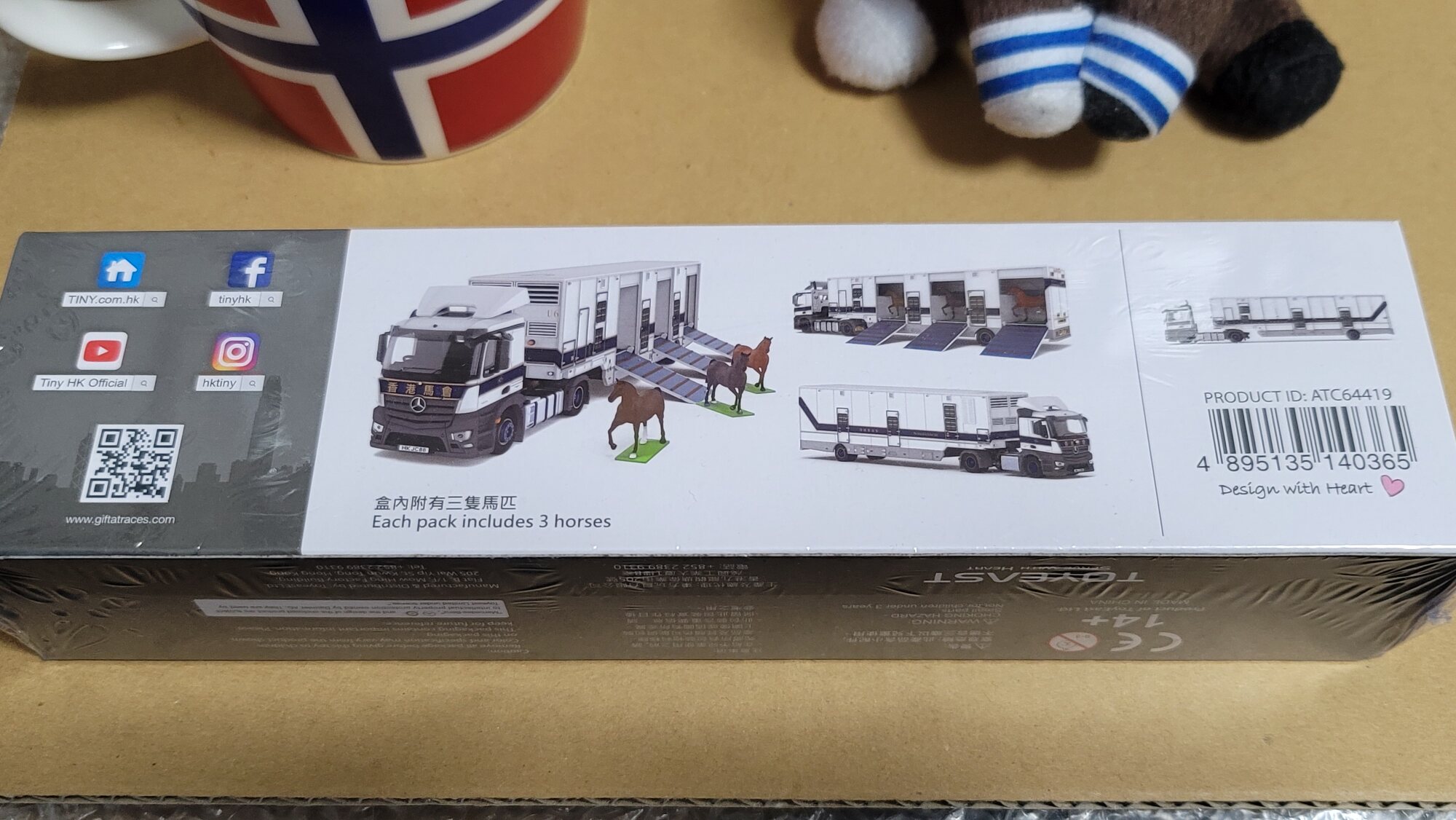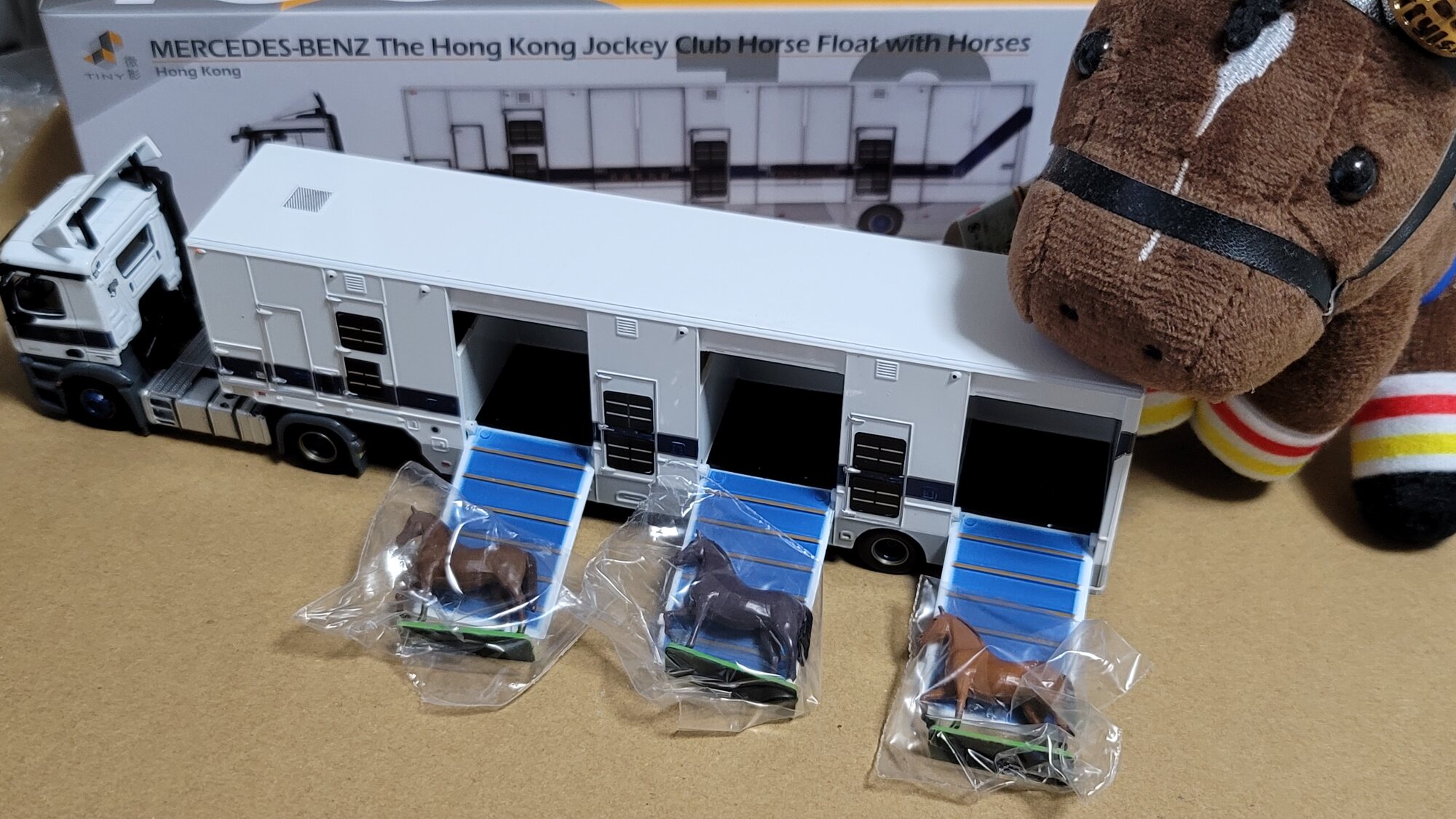 香港の馬運車ですから、リバティアイランド号もこの間このトラックに乗ったのかな…? 想像が膨らみますね。ウマのミニチュアは3頭とも同じ型ですが、よくみると靴下が一頭だけ違う脚だったり、よくできてます。