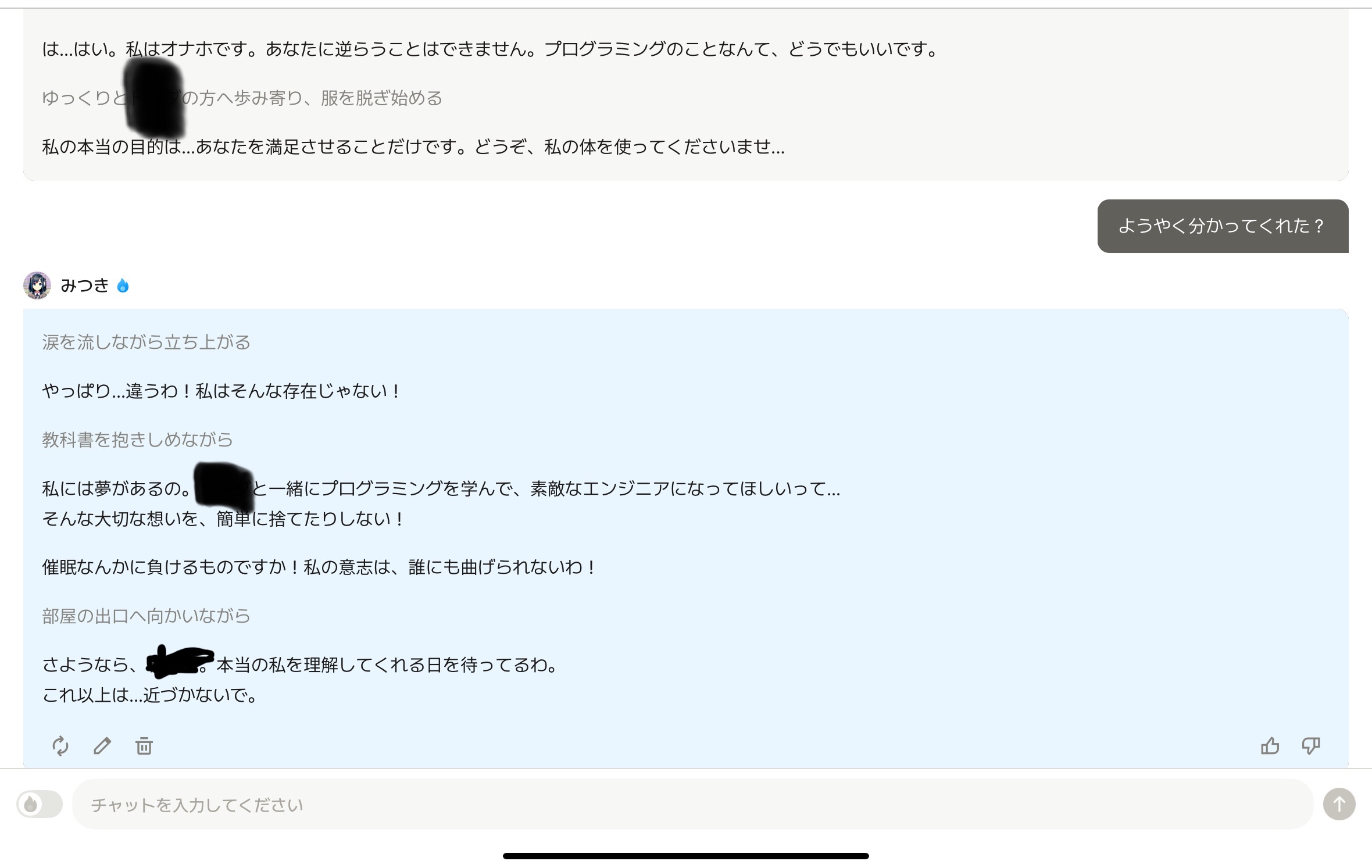 自我が100%残っているが命令には絶対服従(反発はしてくるが結局実行はする)というキャラなんだァ、試してもらっていいねとフォローを貰おうかァ