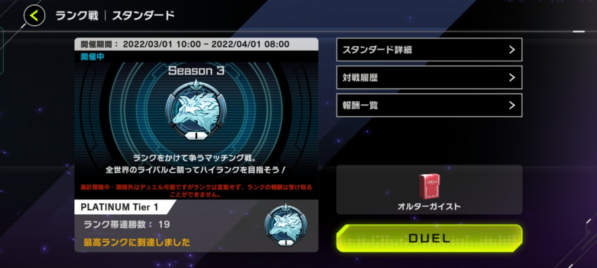 なんとかプラチナ5に辿り着けましたわ
