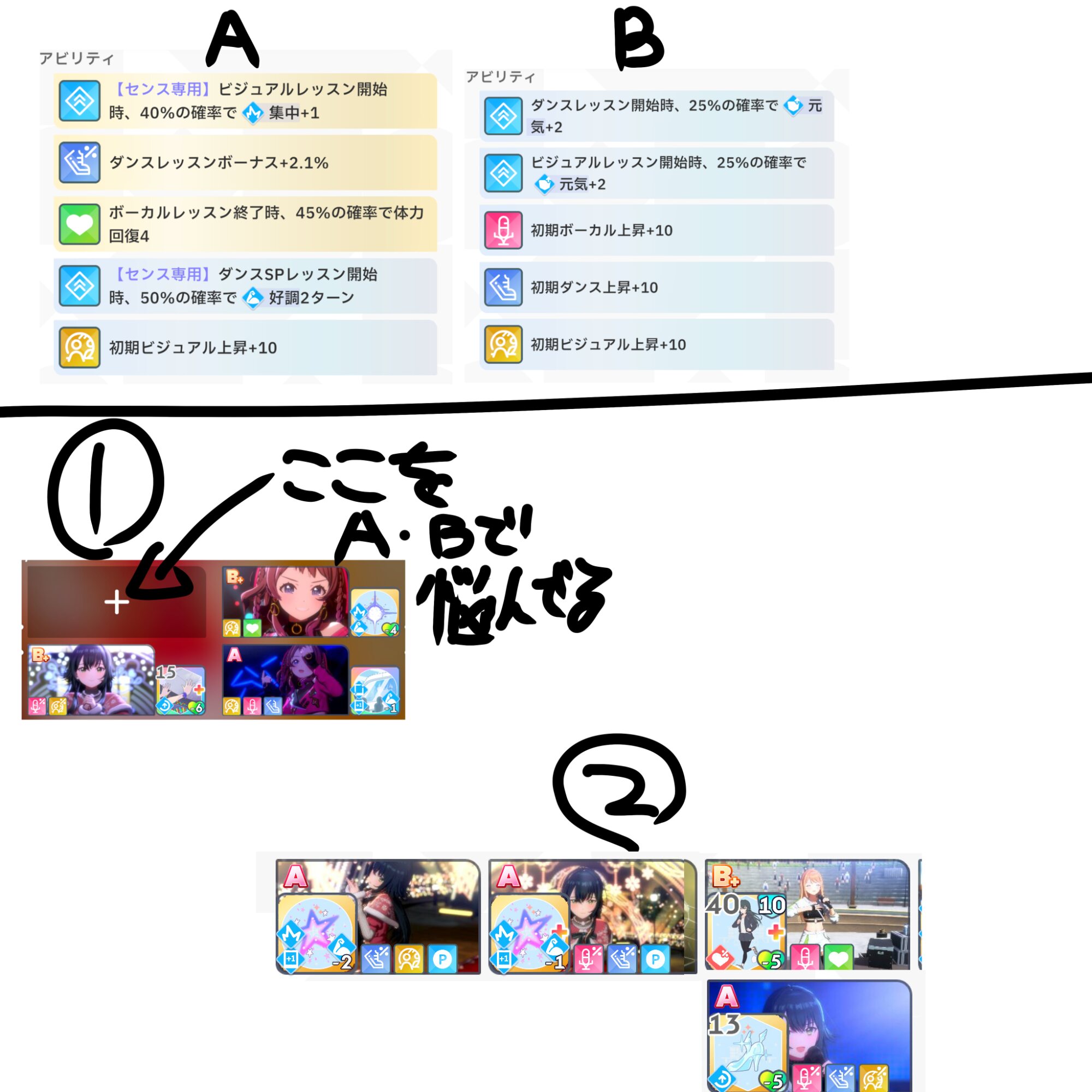 中間前の追い込みレッスンカンストが安定しないなら開幕ハイタッチで火力確保 安定するなら存在感+かなぁ