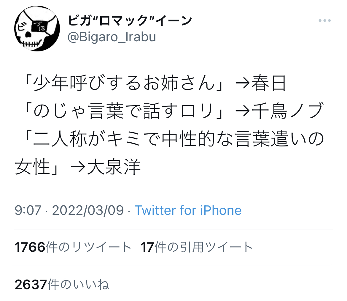 「二人称がキミで中性的な言葉遣いの女性」→大泉洋 — ビガ“ロマック”イーン (Bigaro_Irabu) 2022年03月09日 - 2二次元好きの匿名さん22/03/09(水) 13:08:08