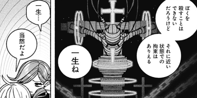 小説は上半身裸で有刺鉄線で両手吊るされて身体に杭を打たれ電流と薬物による拷問、実写はボロボロ着衣の上から鎖で両手吊るされてるだけだがとある事情で精神崩壊済なのでこっちの方が痛々しい