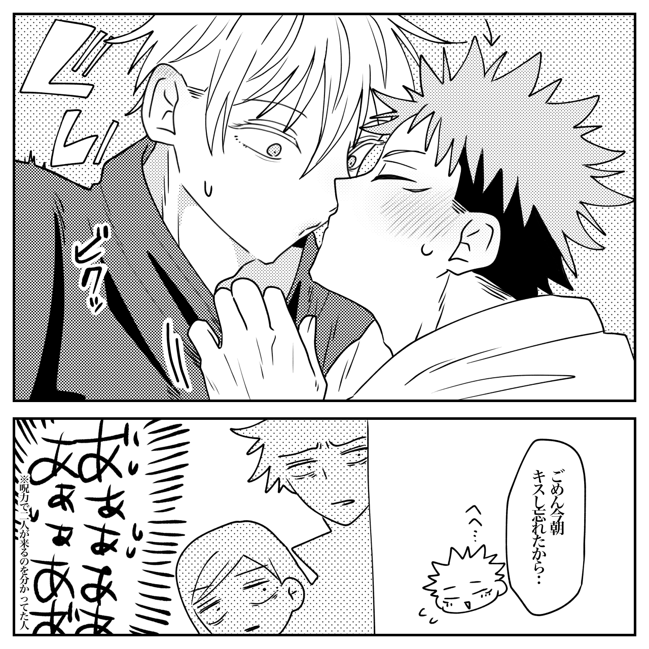 スレ主の絵柄め~っちゃ好き!!浮かれて外でもキスする積極的な虎杖もかわいいし社会的な死と隣合わせの純愛にビクッとなる五条もかわいいねオイ耳赤くなってねぇか?