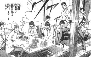 キャンピングカーですき焼きをするブライアンとトレーナーとハヤヒデ
