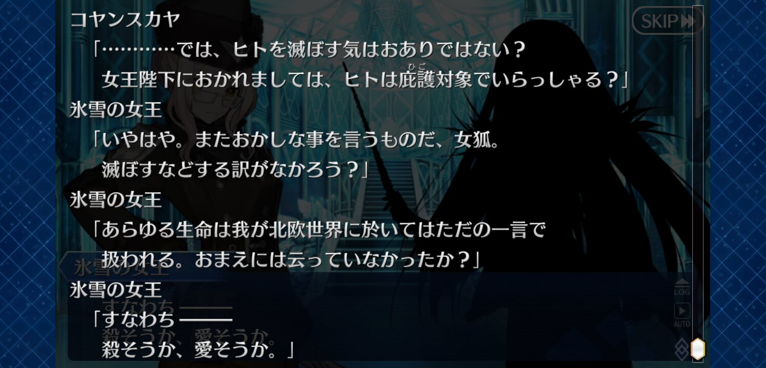 神様ポジションのスカディさんが敵対存在の巨人に対する絶対命令権なんていうヤバいもん持ってるってことは、この北欧でのラグナロクは神様全員消える前に、巨人側を神様側が下したって感じなのかね…?