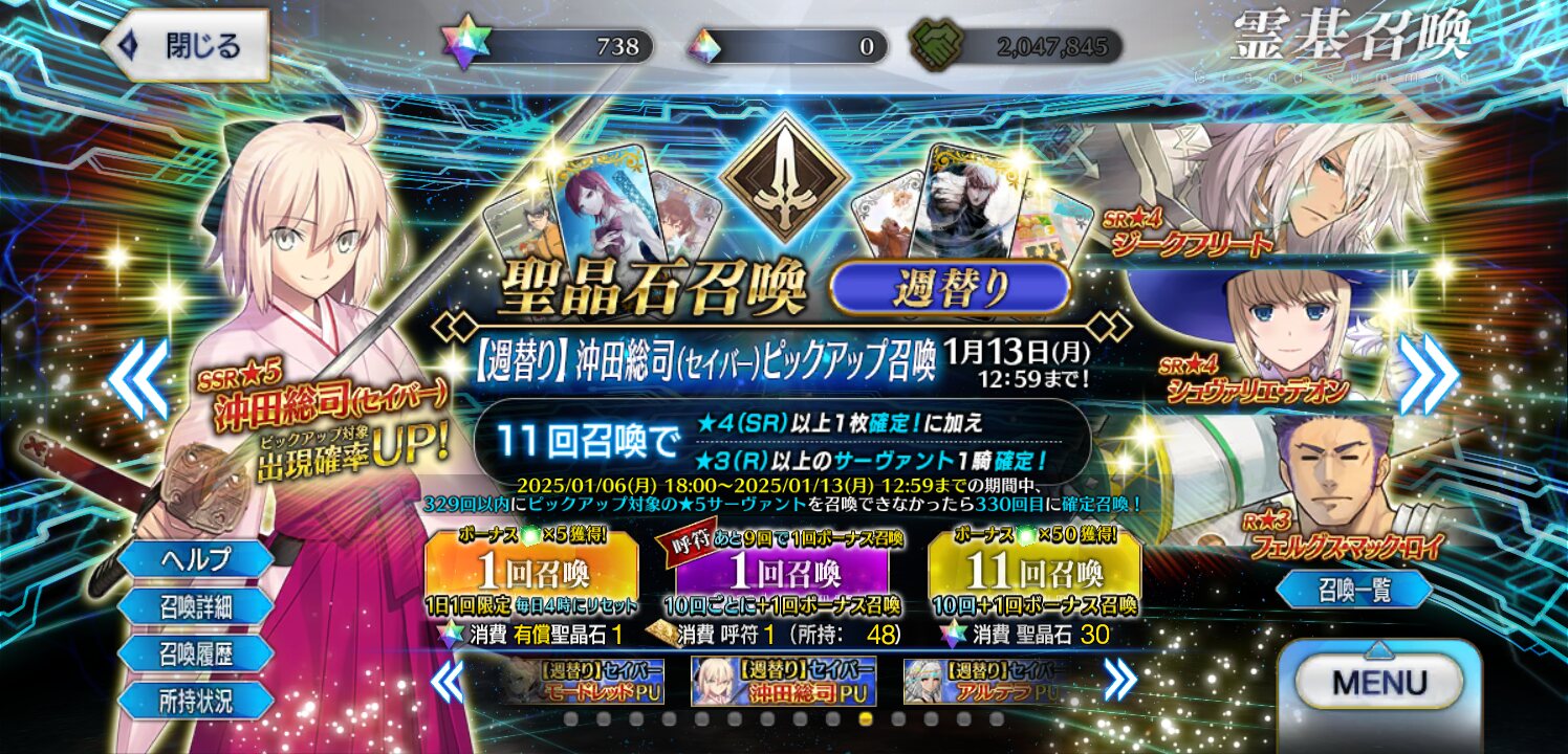 ピックアップされてる中でリストアップ対象は両儀式と沖田総司…………沖田総司は悠木碧さん担当…………石は738、呼符48………