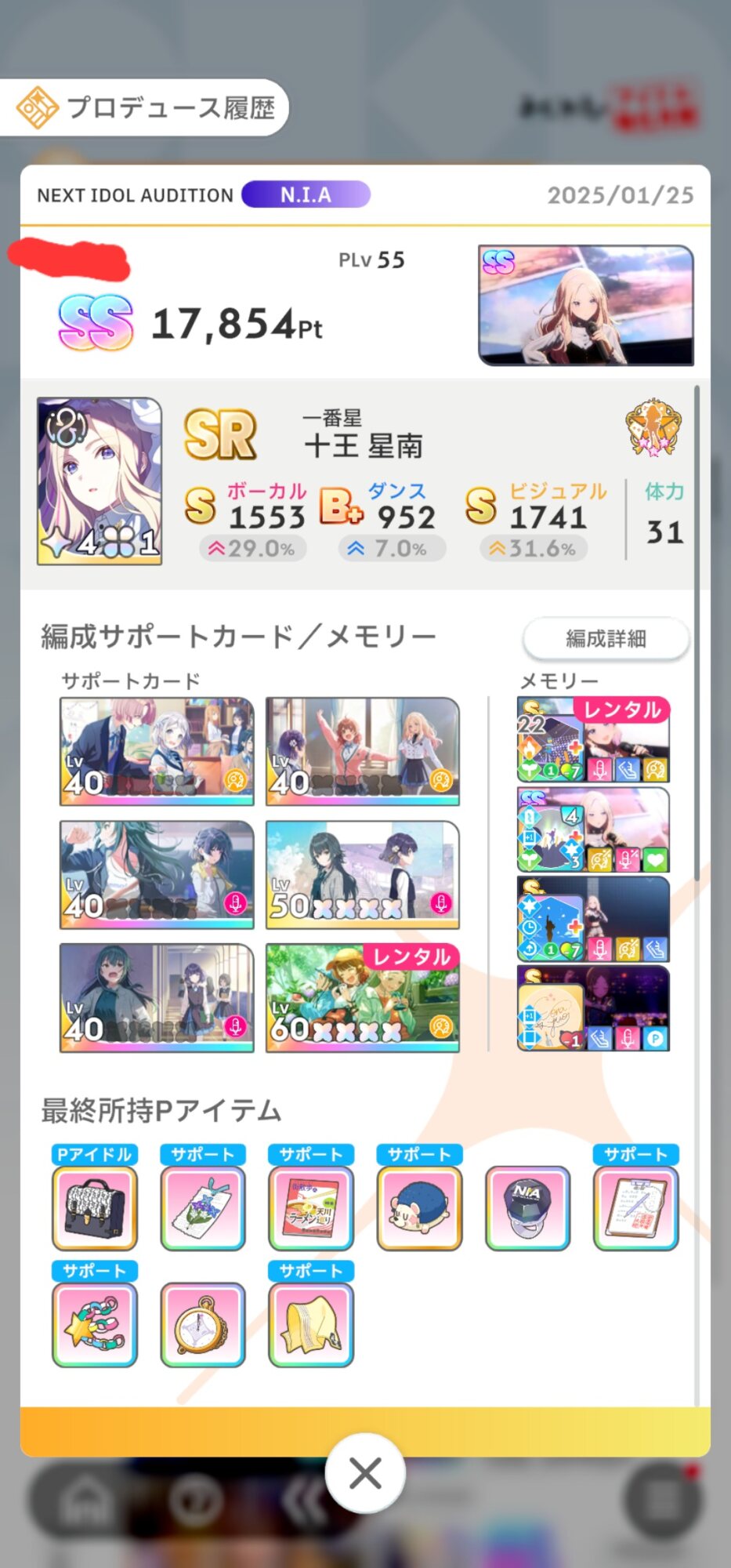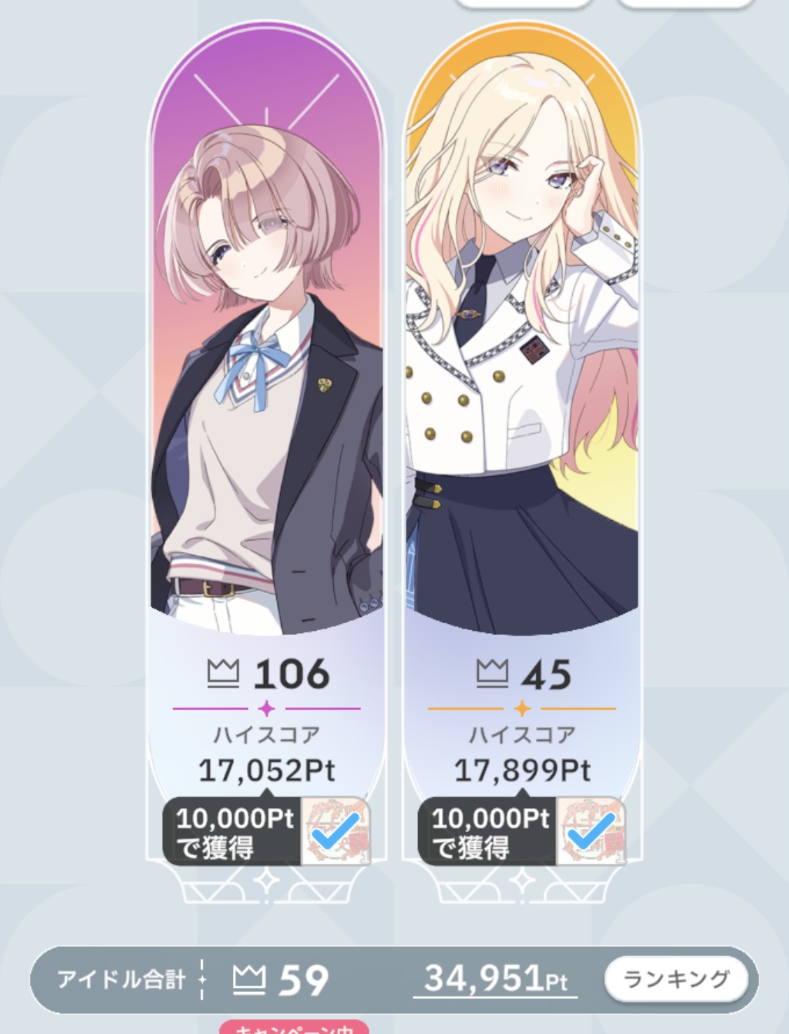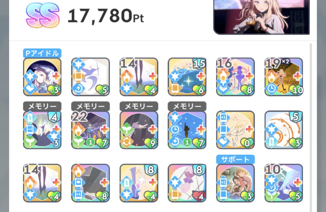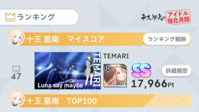 フローライト麻央で現状75位ぐらい。SS+取れれば安心なんだけど、センス型だと試行回数重ねないと高得点出せないから、結構大変。