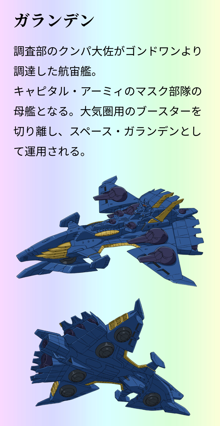 初めてこの姿を見た時「SEEDなりのグワジンのオマージュなのかな?」って思った、艦長も中の人キシリア閣下だし
