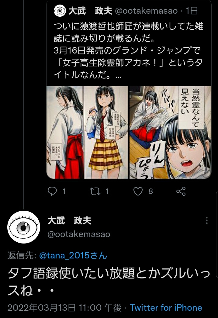 <a href="https://twitter.com/tana_2015" target="_blank">@tana_2015</a> タフ語録使いたい放題とかズルいっスね・・ — 大武 政夫 (ootakemasao) 2022年03月13日