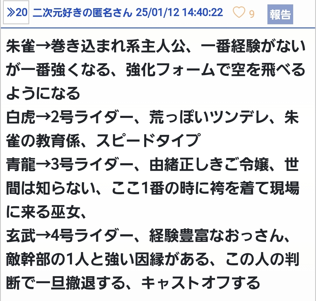 …四神モチーフライダーあるとすれば一号から四号はどれになるんだろ??