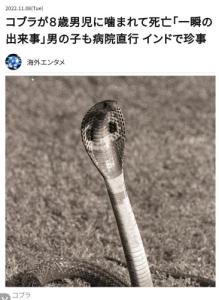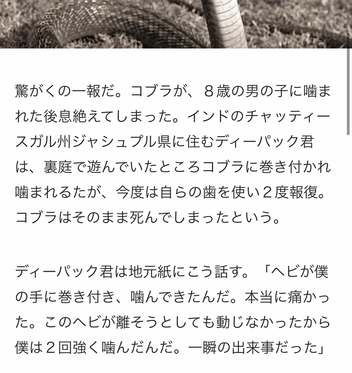 驚がくの一報だ。コブラが、8歳の男の子に噛まれた後息絶えてしまった。インドのチャッティースガル州ジャシュプル県に住むディーパック君は、裏庭で遊んでいたところコブラに巻き付かれ噛まれるたが、今度は自らの歯を使い2度報復。コブラはそのまま死んでしまったという。
