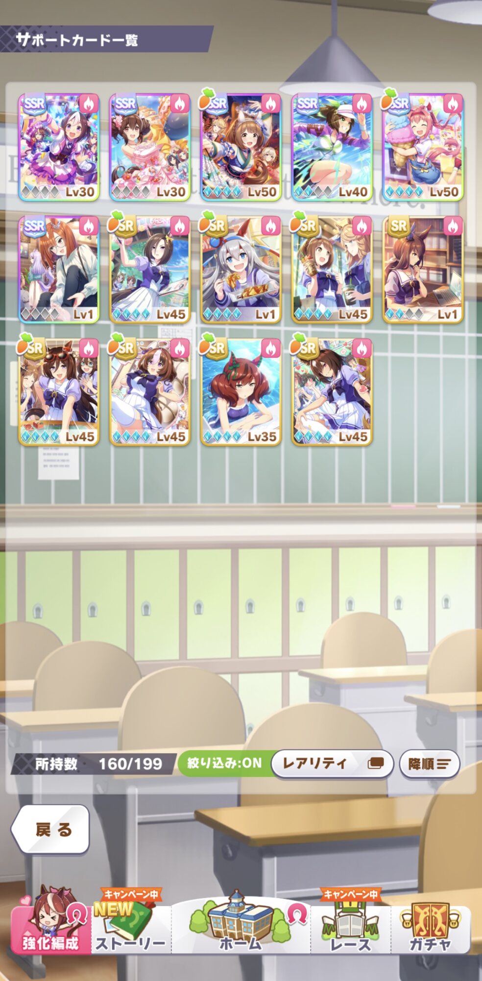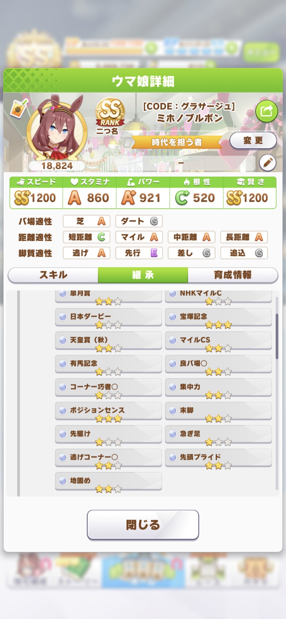 ・ステータス盛れてない割にレースそんなに出てないのでどちらかに定めてもっと特化すべき。理事長のボーナス貰えそうにないならトレ優先も考えていい
