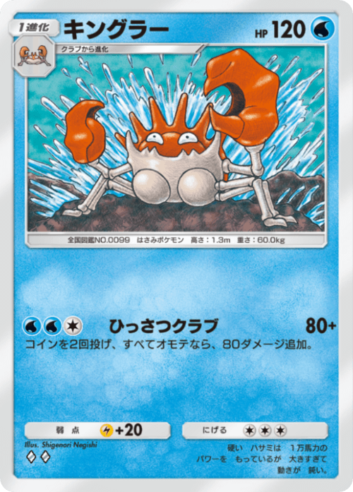 キングラーのかいりきバサミはコインを2回投げて2回連続で表を出せれば素の80ダメージに追加で80ダメージプラスされ160という恐るべき数値となり、大概のexポケモンを一撃で倒すことができる強力なワザである