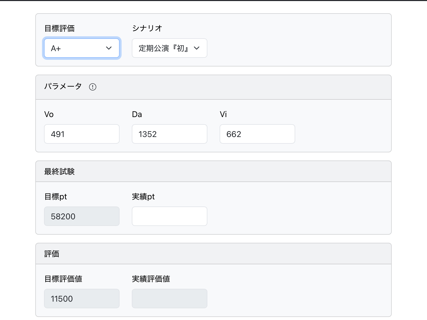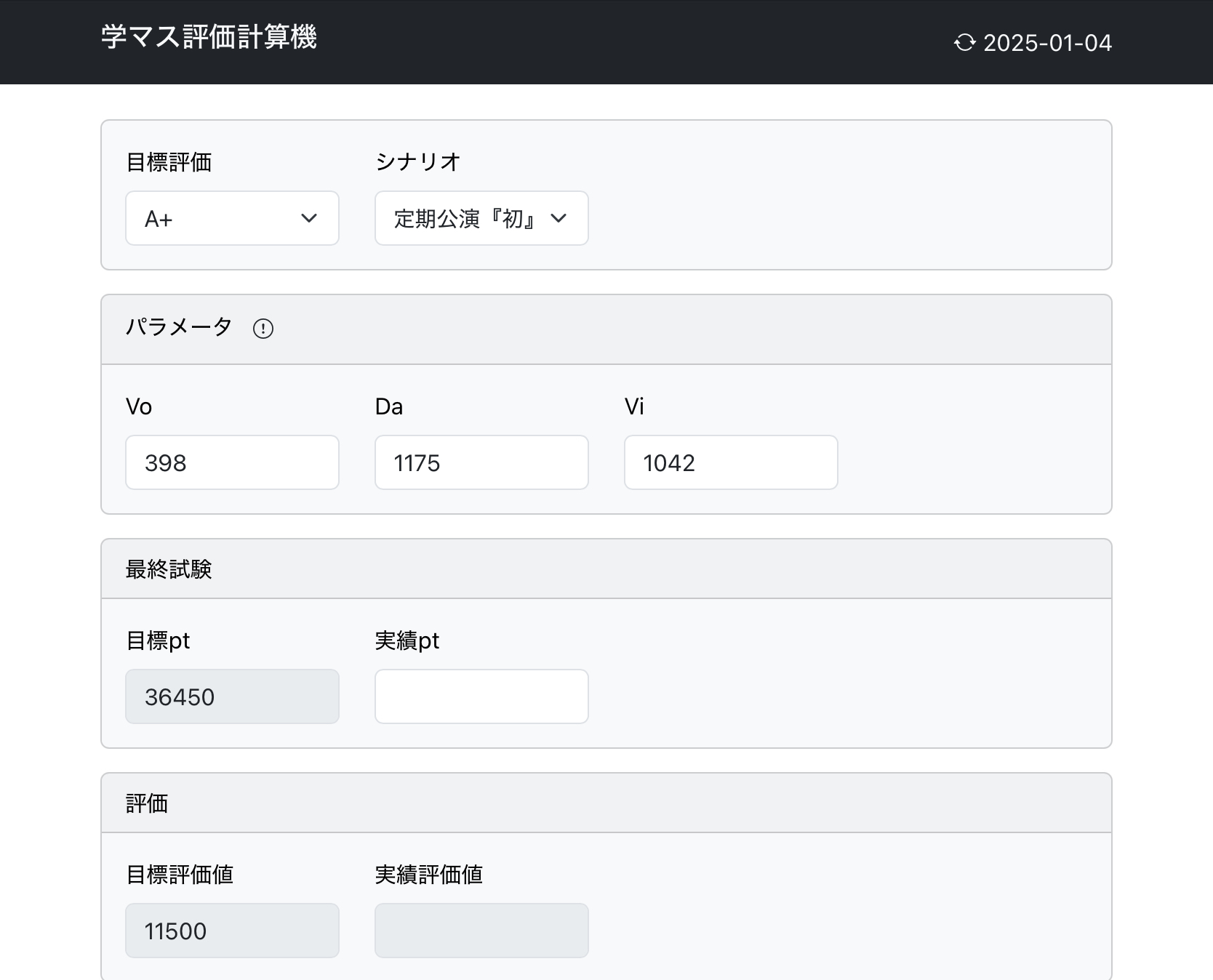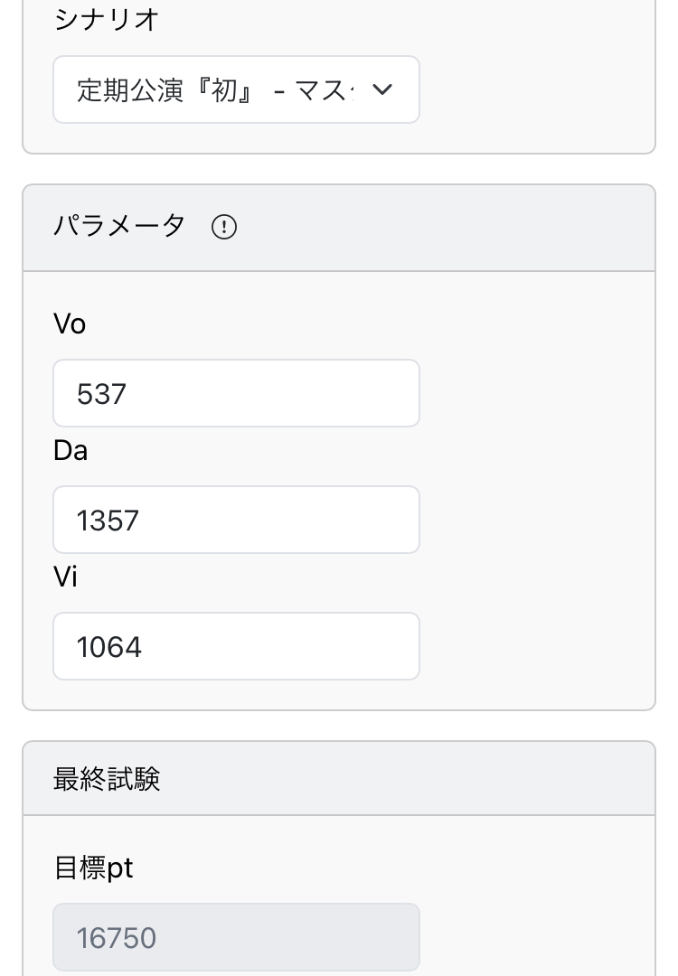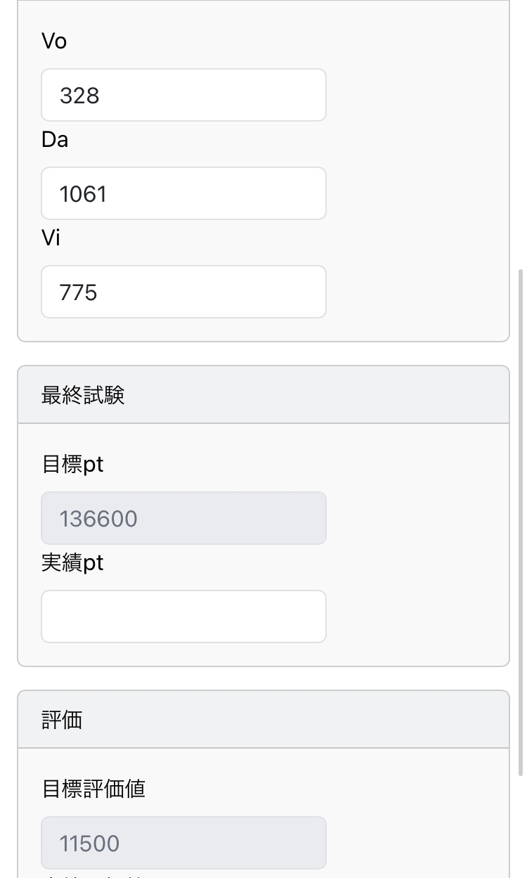 ↓こいつに各ステータス(最終試験後にちょっと増えるので最終試験前のを)入力すれば最終試験で必要なスコアがわかるぞ