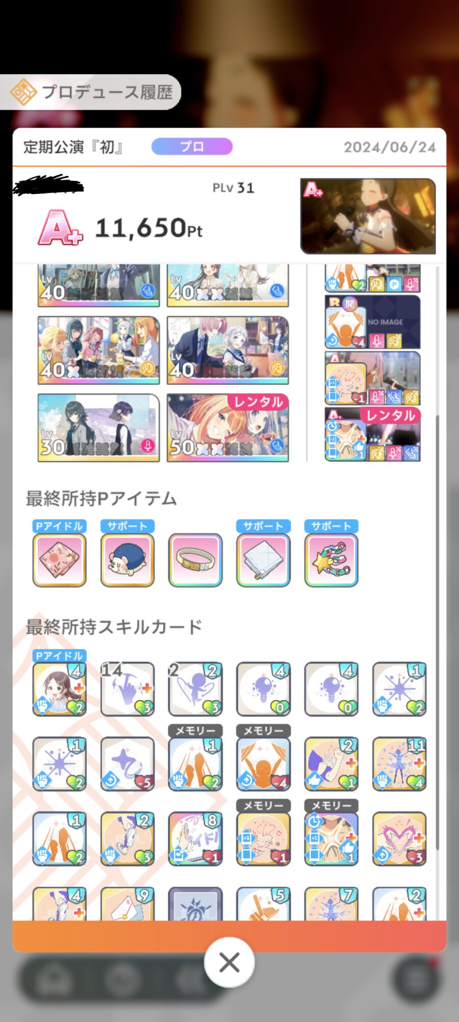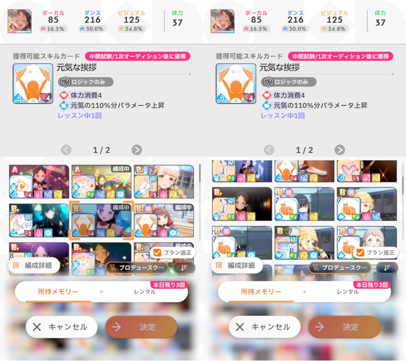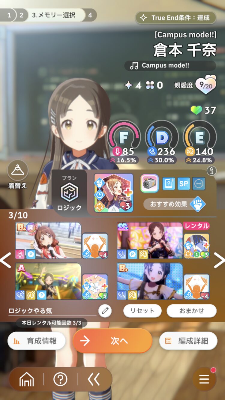 ・上記の通り最終試験のスコアが重要なので最終前の追い込みではできるだけドリンクを温存しつつパーフェクトを狙う(中間よりはカードが揃ってるはずなので難易度は多少マシなはず)