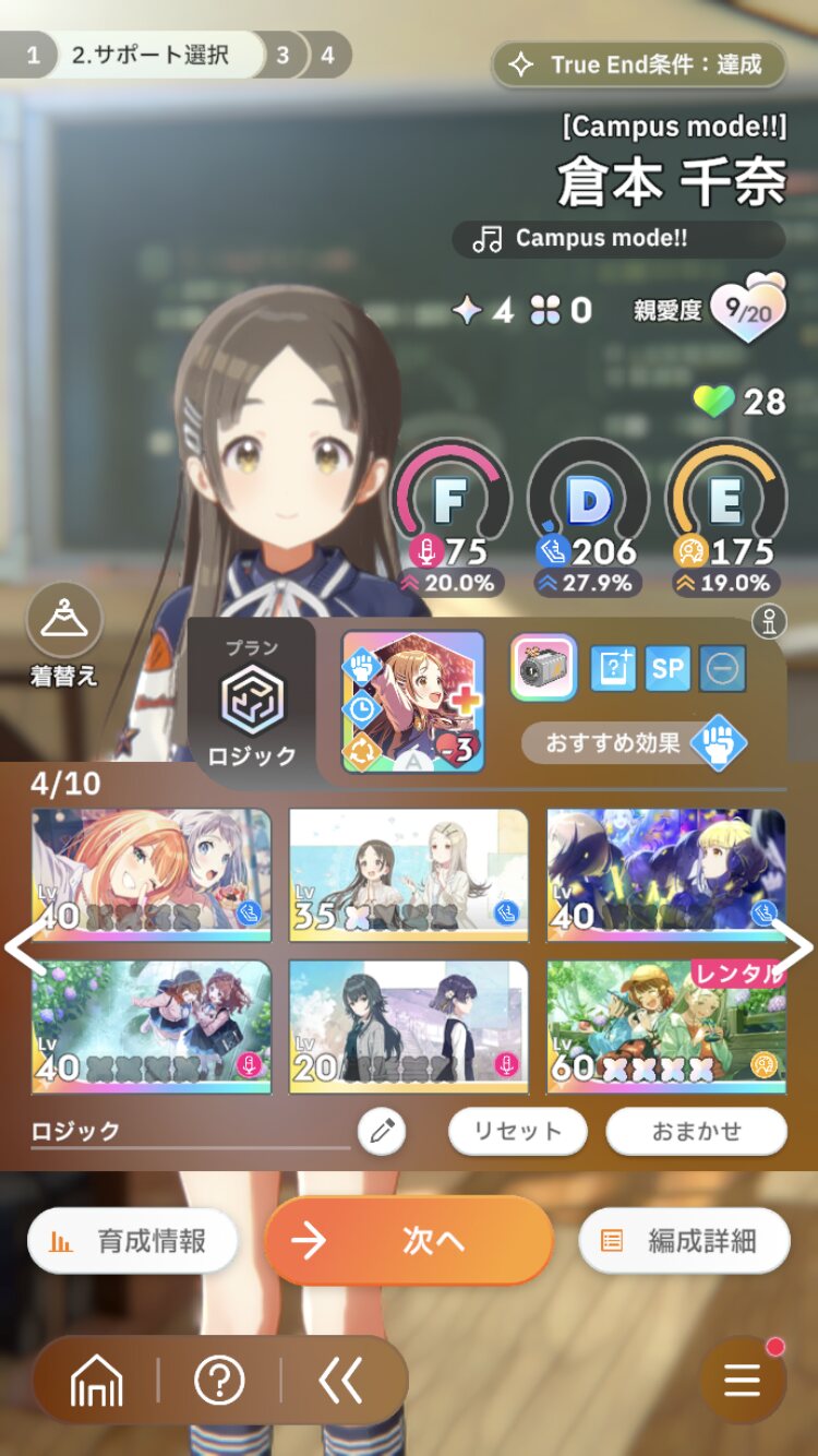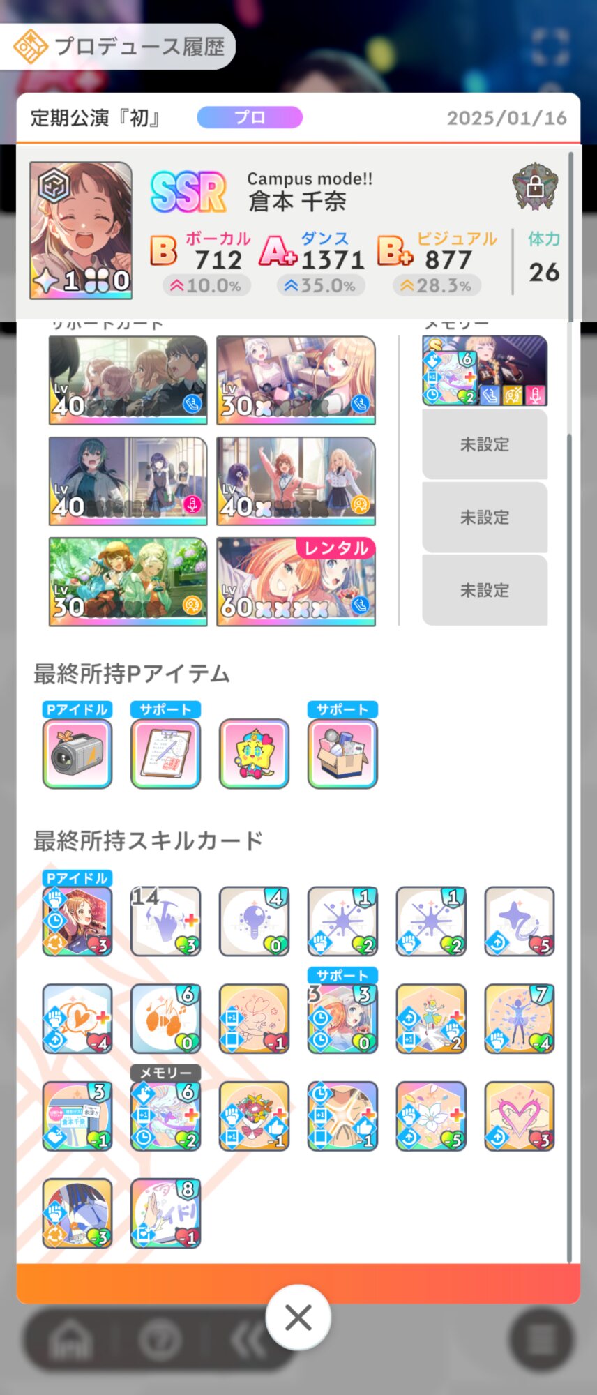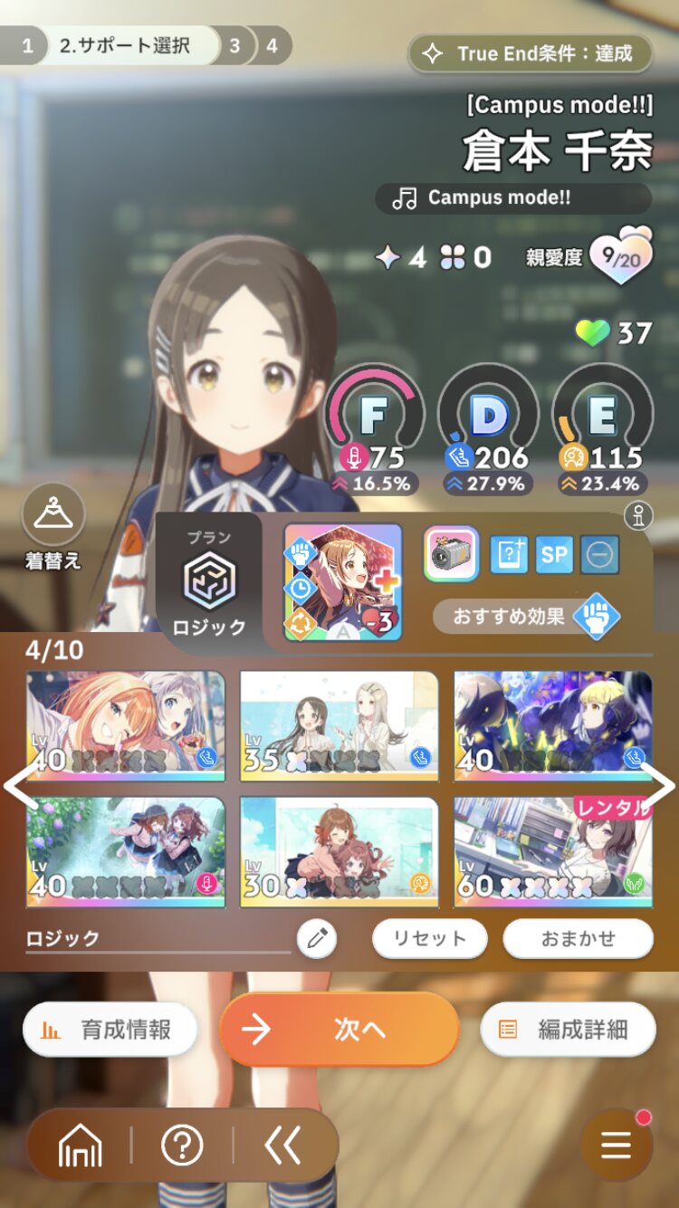 あさり先生は抜いてViのSP率upサポカに変える。Voは授業と追い込みレッスンのボーナスで上げるのを意識すればステータスはどうにかなると思う。