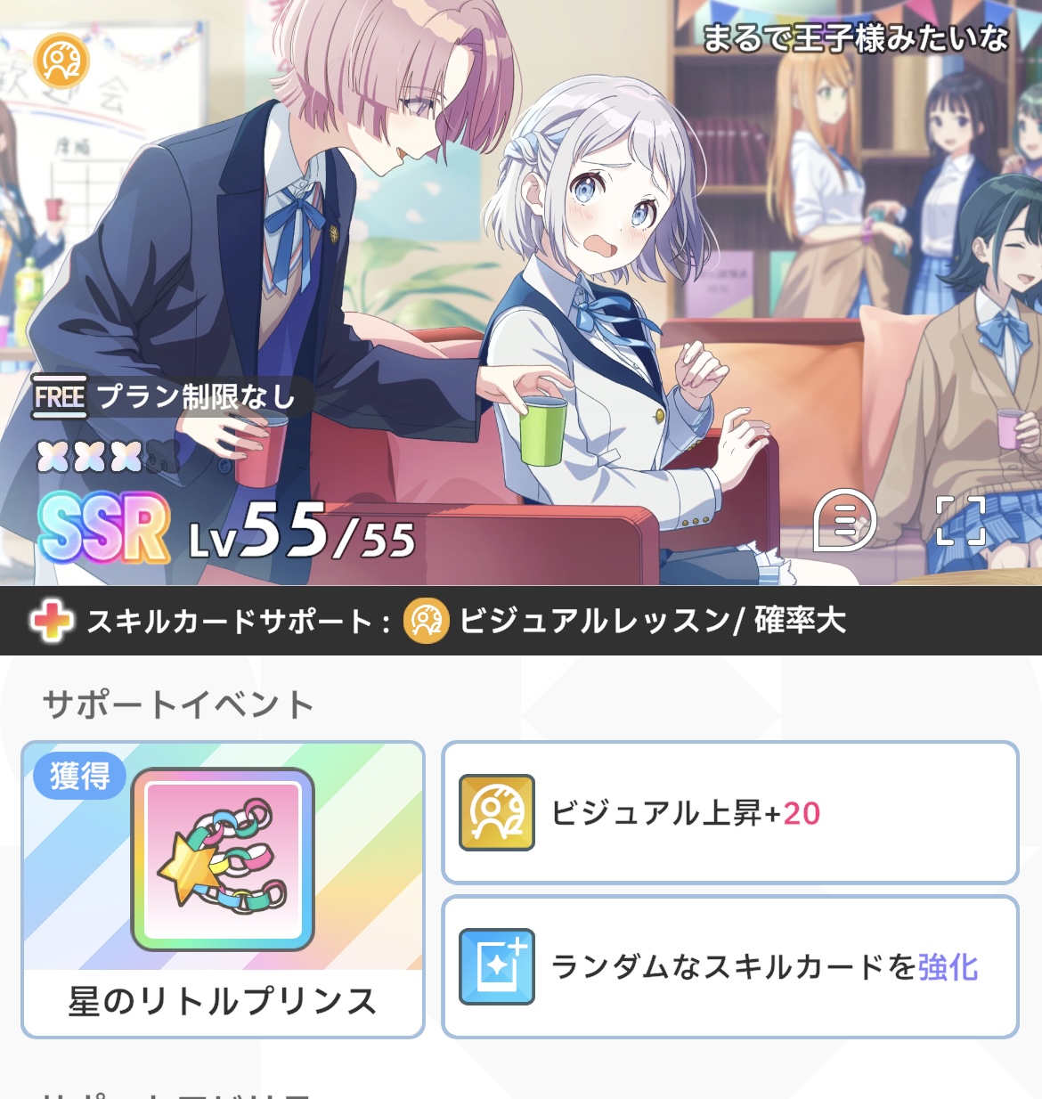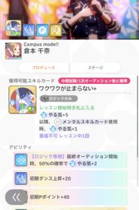 とりあえず「ワクワクが止まらない(改造+1で開始ターン手札に入るやつ)」のレッスンボーナスダンス2.1%、ビジュアル2.1%くらいのを探してみな