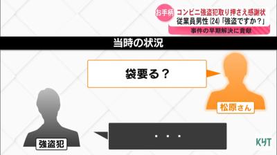 強盗の気勢を抵抗しない上、気遣いをする姿勢で削いだ状態にするどころか片手を現金をいれた袋で塞いだ上で制圧に乗り出す何て強盗も思わずパニックになったと思うんだよねガチでね