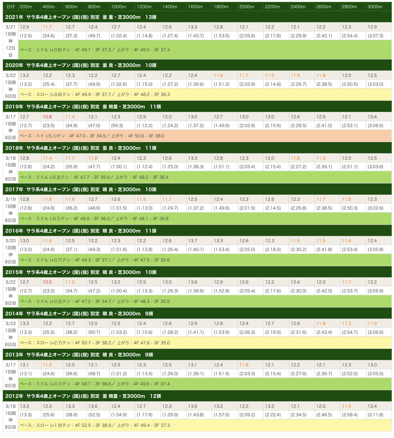 それでも不利なのは不利だけど、12年サンカルロみたいに、人気馬なら突っ込んで来られる程度の余裕は生まれるもん(過去10年のラスト3F目最速の年は道悪年があるけど、道悪の場合はまず道悪による馬場バイアスを見る必要があるけどもん)