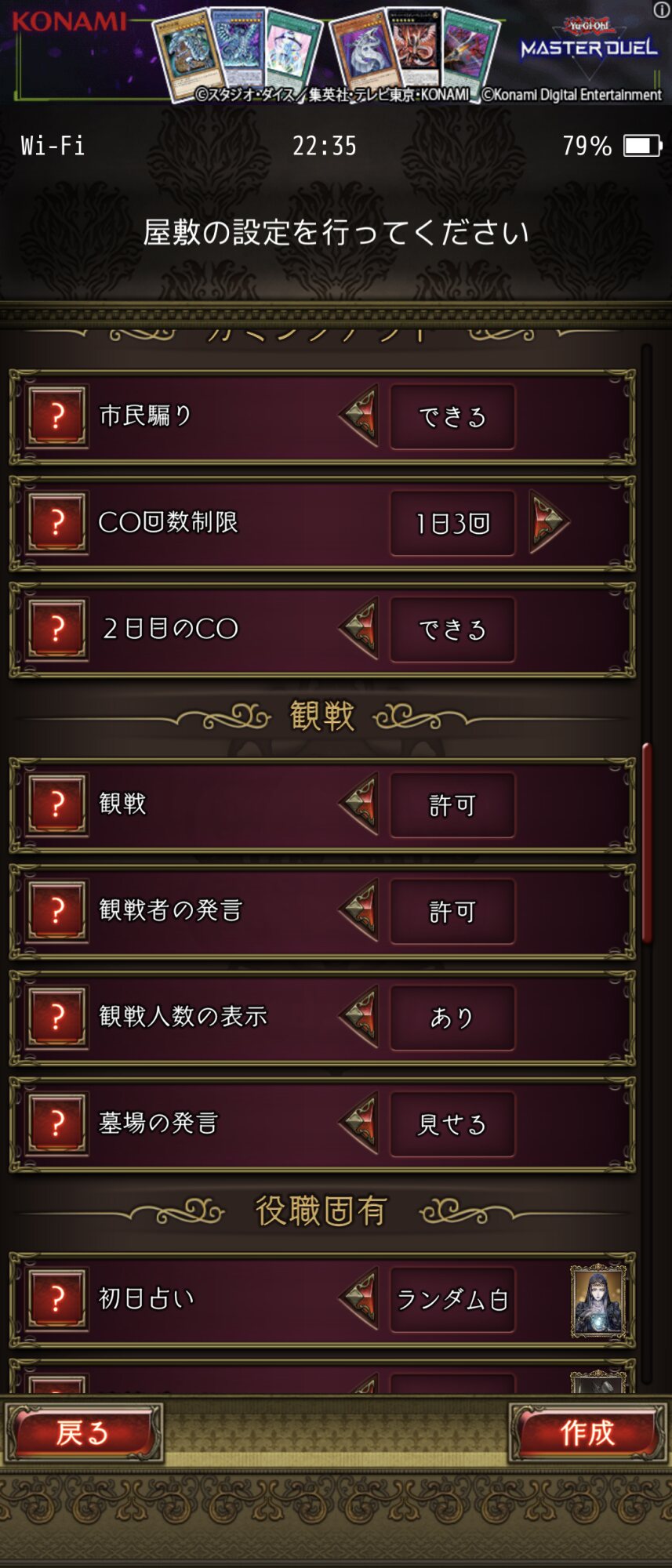 「15人逆村」で基本構成は「人狼・賢狼・狂人2・狂信・妖術・黒猫・ささやく狂人(佐々木)・サイコ/猫又(罠師)・賢者・暗殺・独裁・わら人形・魔女」