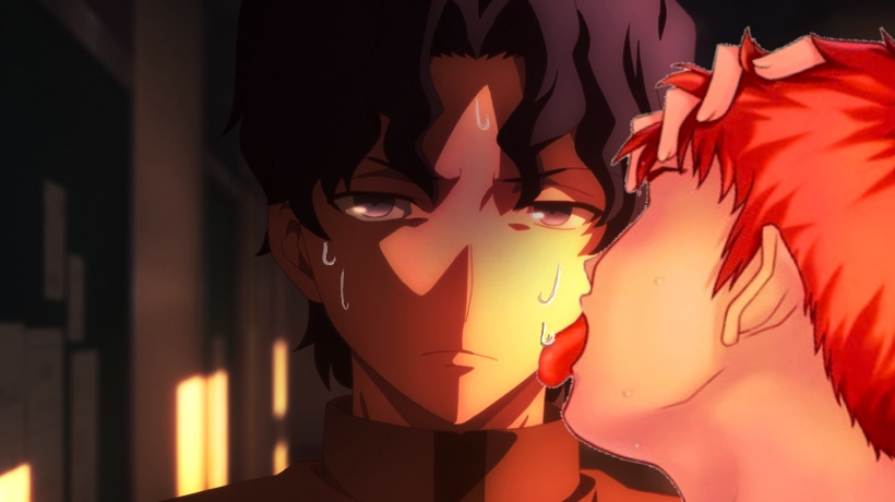 英雄王の表情、士郎の隠された目、微妙に紫色の肌、手の絶妙な位置