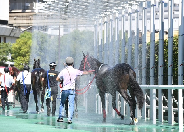 いつも思うけど一緒に浴びる厩務員さん大変だよなずぶ濡れで