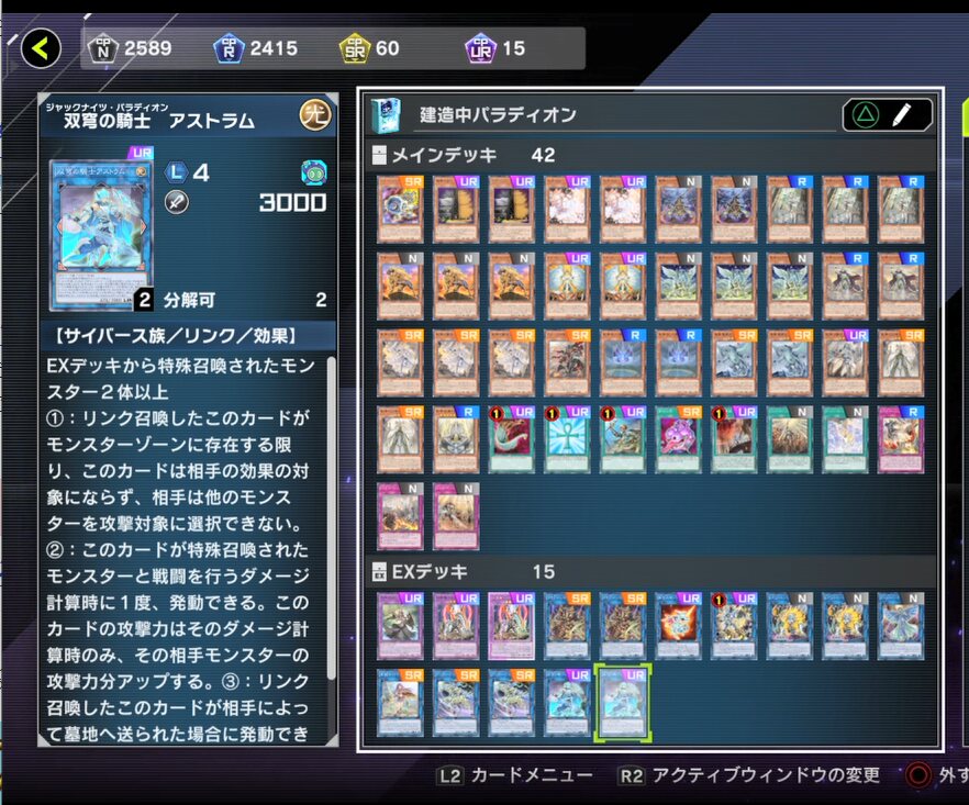 アストラム2枚入れてるのは枠無理矢理埋めるためって側面が強いけどそこはおいおい変える予定。でもいざって時にはアストラムにガンガン活躍もしてもらってきたのでマイフェイバリットカードです。
