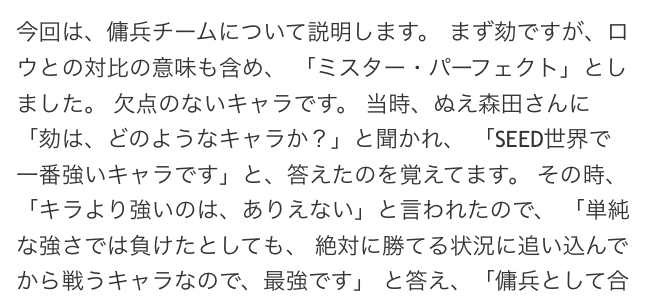 作者のコメント抜きに作中の描写だけで評価すると劾ってソキウスに負けてるしエド相手にも撤退してるしでいうほど無双してる感がないんだよね