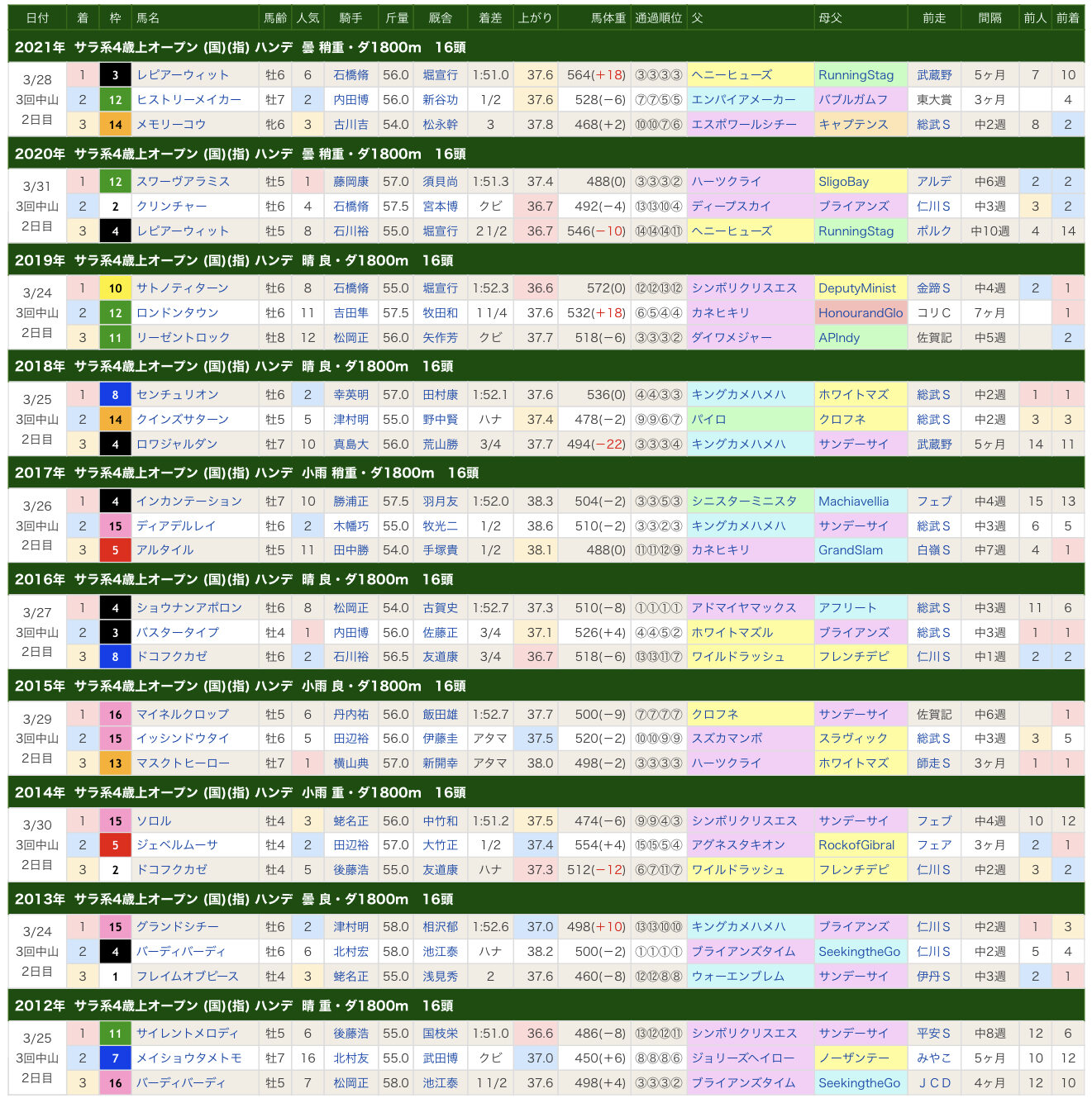 1100m通過は近10年で16年に次ぐ超スロー、しかも差しにくい重馬場、今のタフな中山の馬場が合わさって、前にいた馬以外はどうしようもない展開になったもん