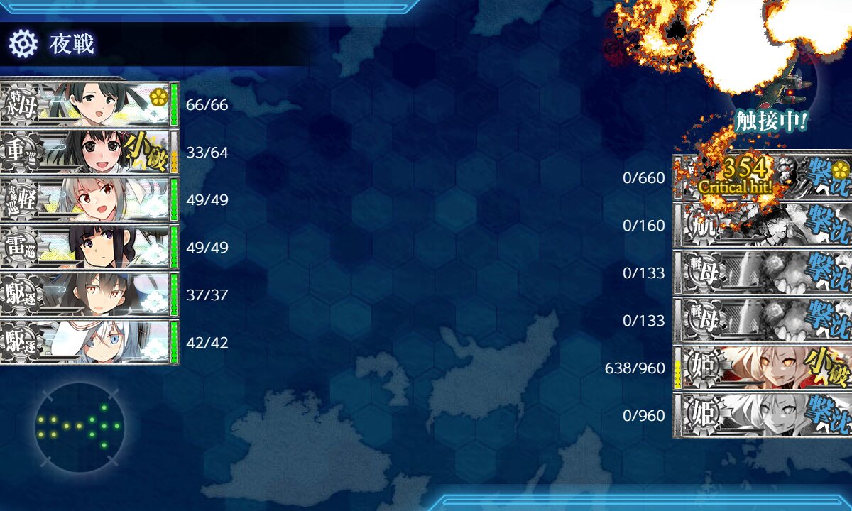 カットインで530とか連撃で300とか昼でポンポン出てるし夜はカットインしなかった霞が200超えてたり清霜が千出したりコマンドーみたいな爆散地帯と化した