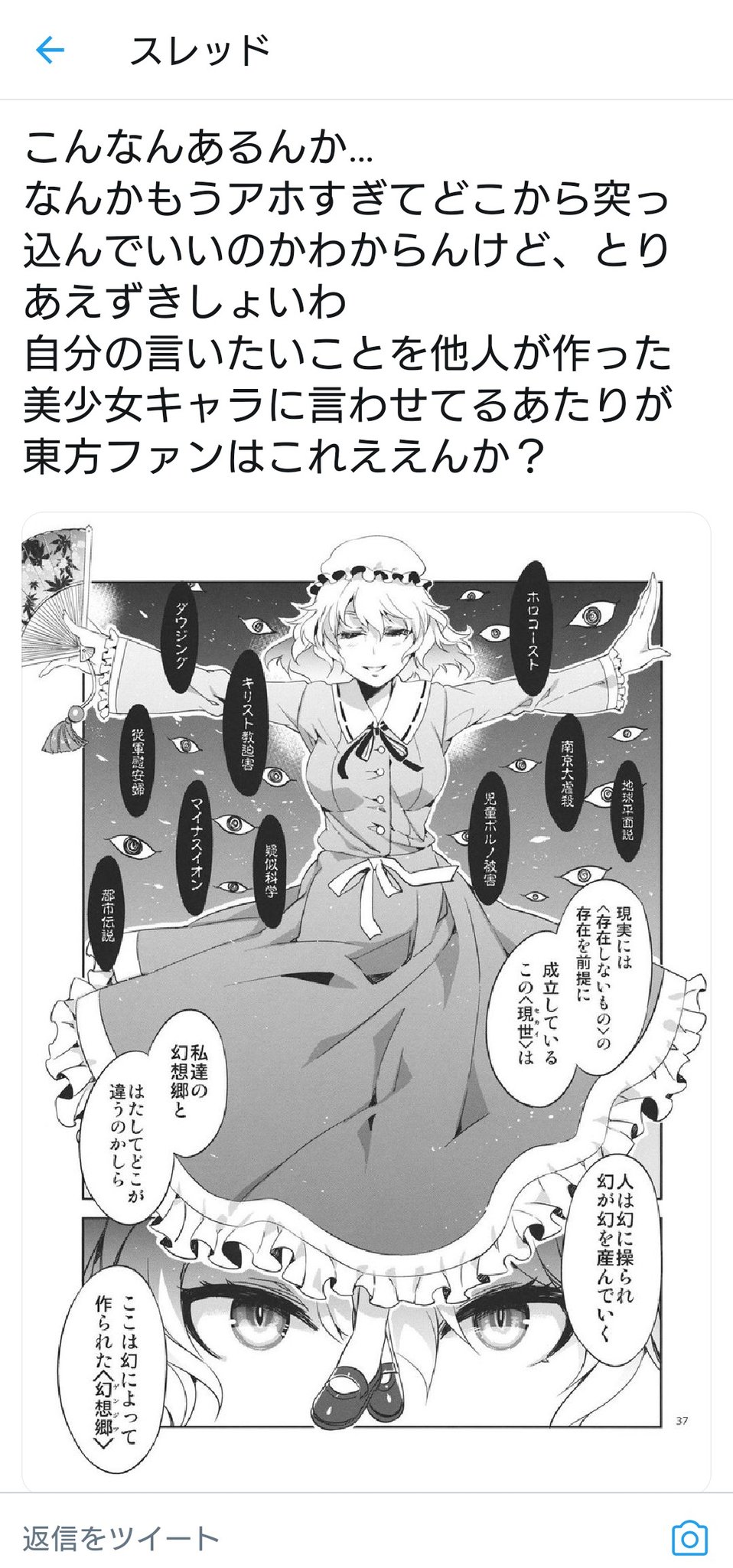 政治思想とか一切関係ない作品のキャラに、話の流れ上一切必要ないセリフなのにホロコーストは実在しないというセリフを脈絡なく言わせた同人誌