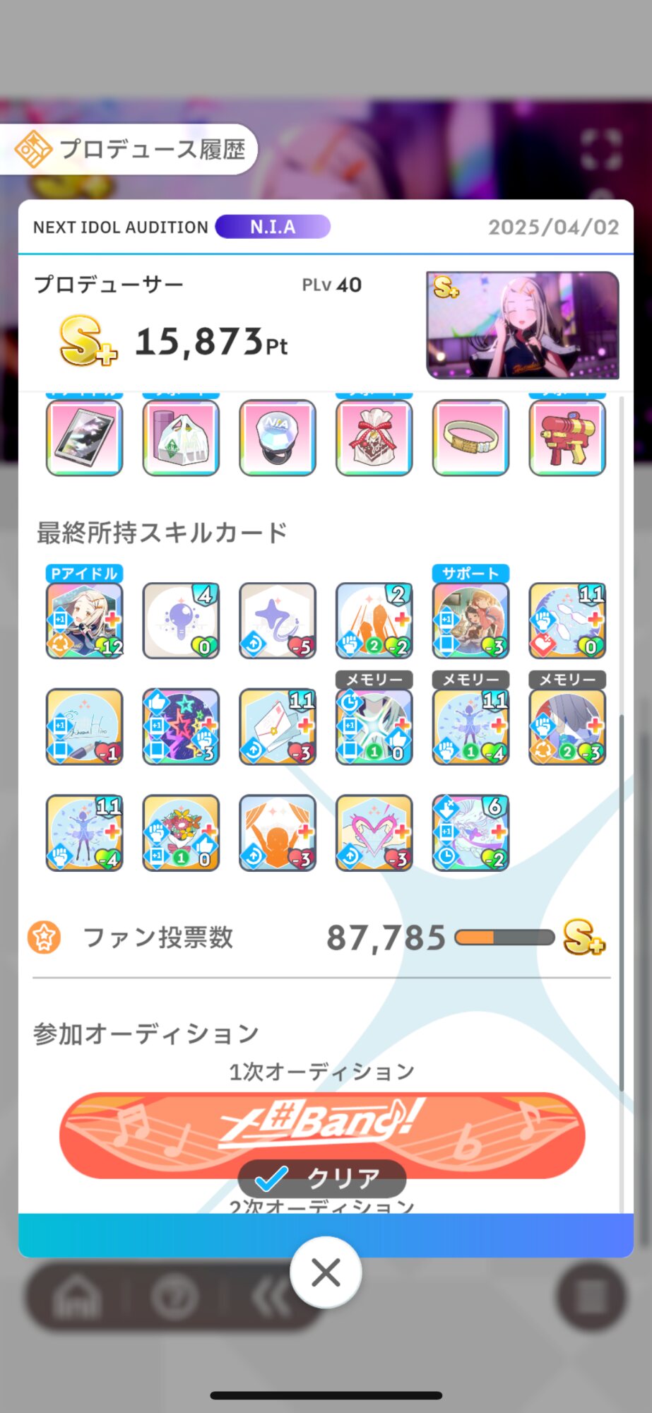 1次オーディションで最低6000、2次で40000を目標にスコア稼げば評価値上がるよ