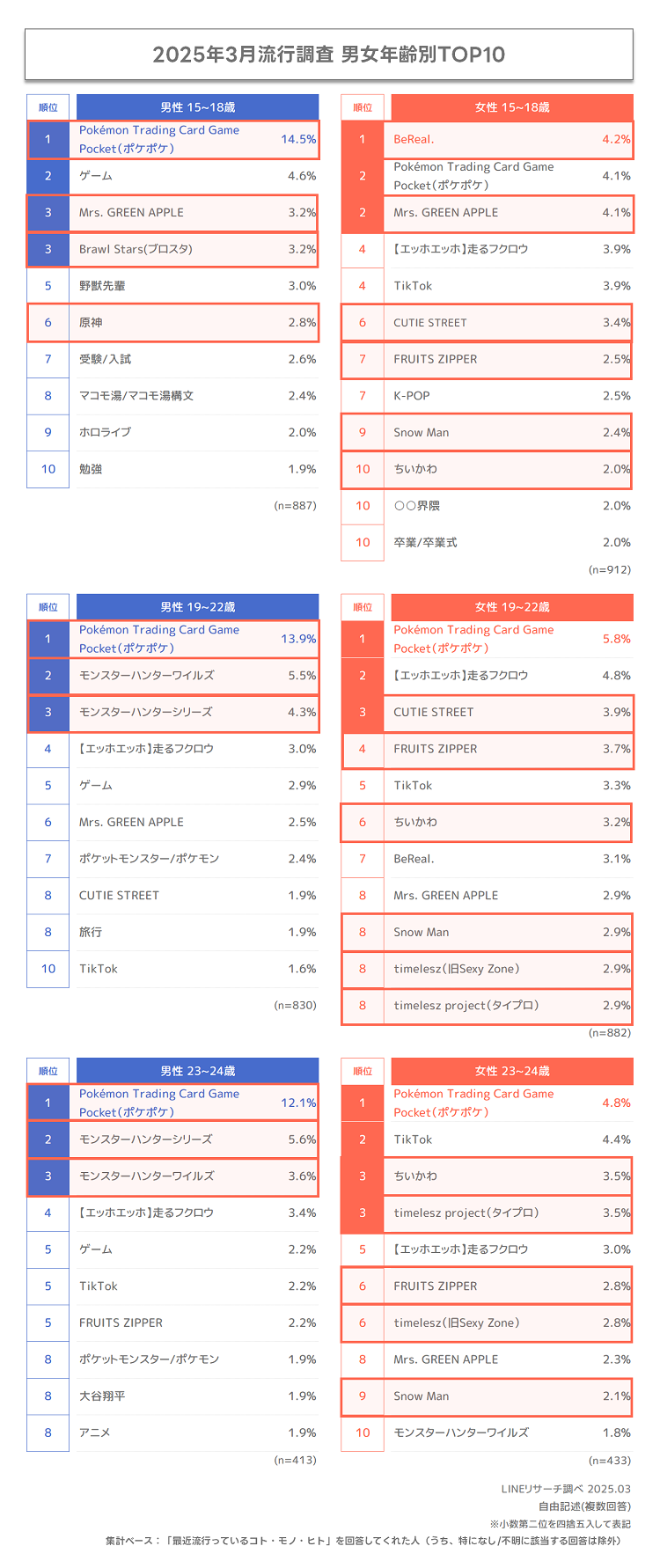 最新Z世代トレンド「ポケポケ」が1位を継続!「【エッホエッホ】走るフクロウ」が初登場で2位に! | LINEリサーチ調査レポート|リサーチノート powered by LINELINEリサーチでは、四半期ごとに全国の15~24歳の男女を対象に、最近の流行について自由記述形式で調査しています。今回は2025年3月期の結果を詳しくお伝えします。lineresearch-platform.blog.jp - 2二次元好きの匿名さん25/04/27(日) 20:21:28