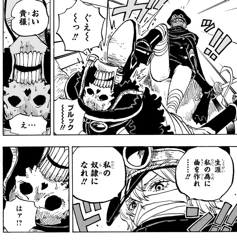 ゾロがルフィのためなら大剣豪の夢を諦められるように、ブルックもルフィへの忠誠を棄てるぐらいならラブーンとの再会を諦められるんだ、似た者同士が深まるんだ