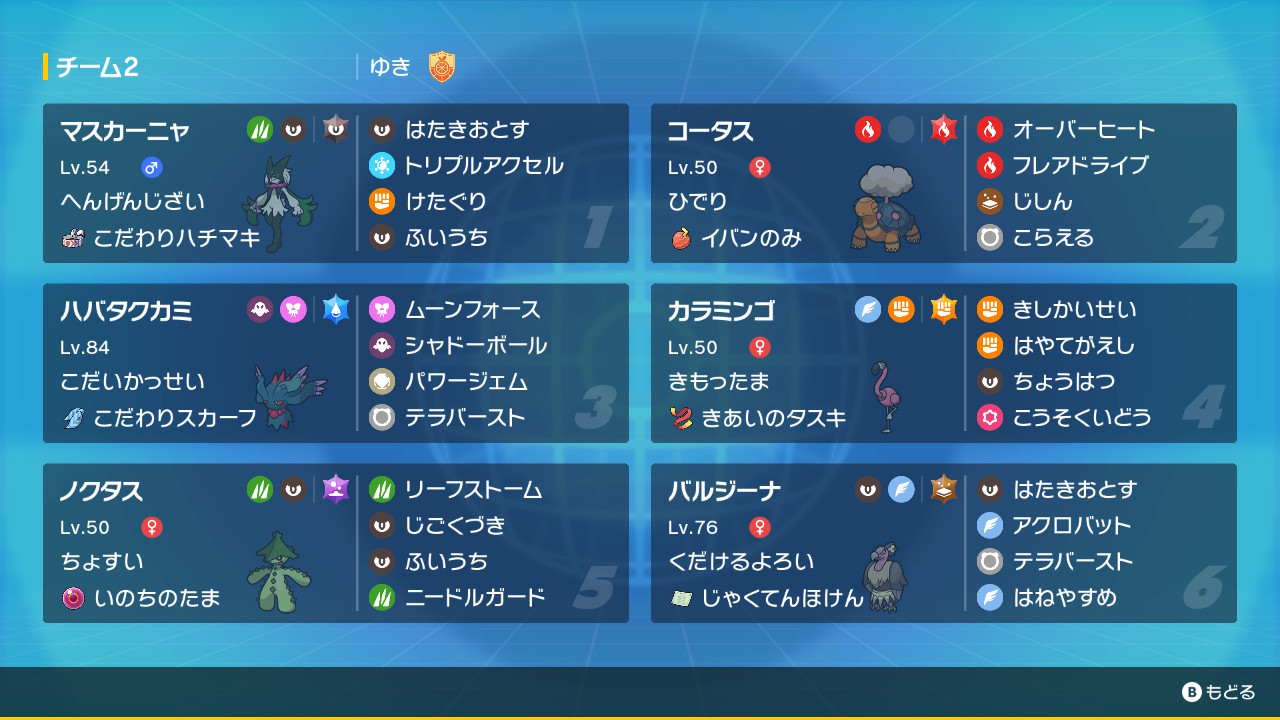 ①同名ポケモン、同じ道具の重複がないように六匹ポケモンを選定する