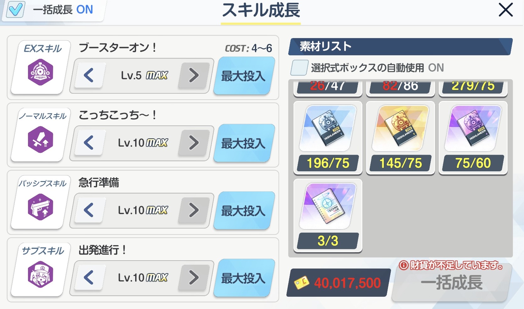 スキルはヒマリや正月ハルカみたいなCOST関連、キサキやリオのようにEXスキルそのものに干渉する類は即座にMAXに出来るようにしてるなぁ