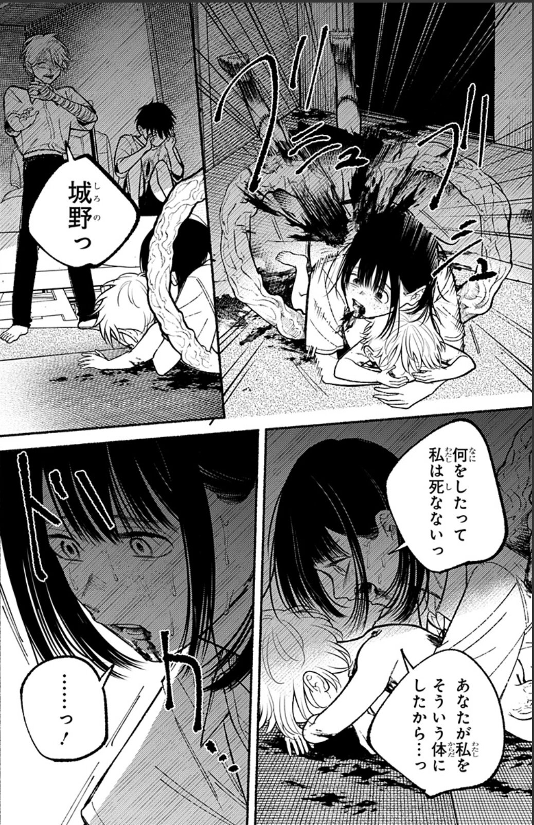 城野も謎触手でちー坊の体食ったりする機能はあるから幼少時に細胞書き換えられて普段は触手が人の肉体に変化してる所に塊貫拳打ち込んで化物要素に自壊を促す命令させたなら謎にボトボト落ちてる角みたいなのも人の形を構成できなくなった触手の残骸なんやないかとまでは考えたんだよね