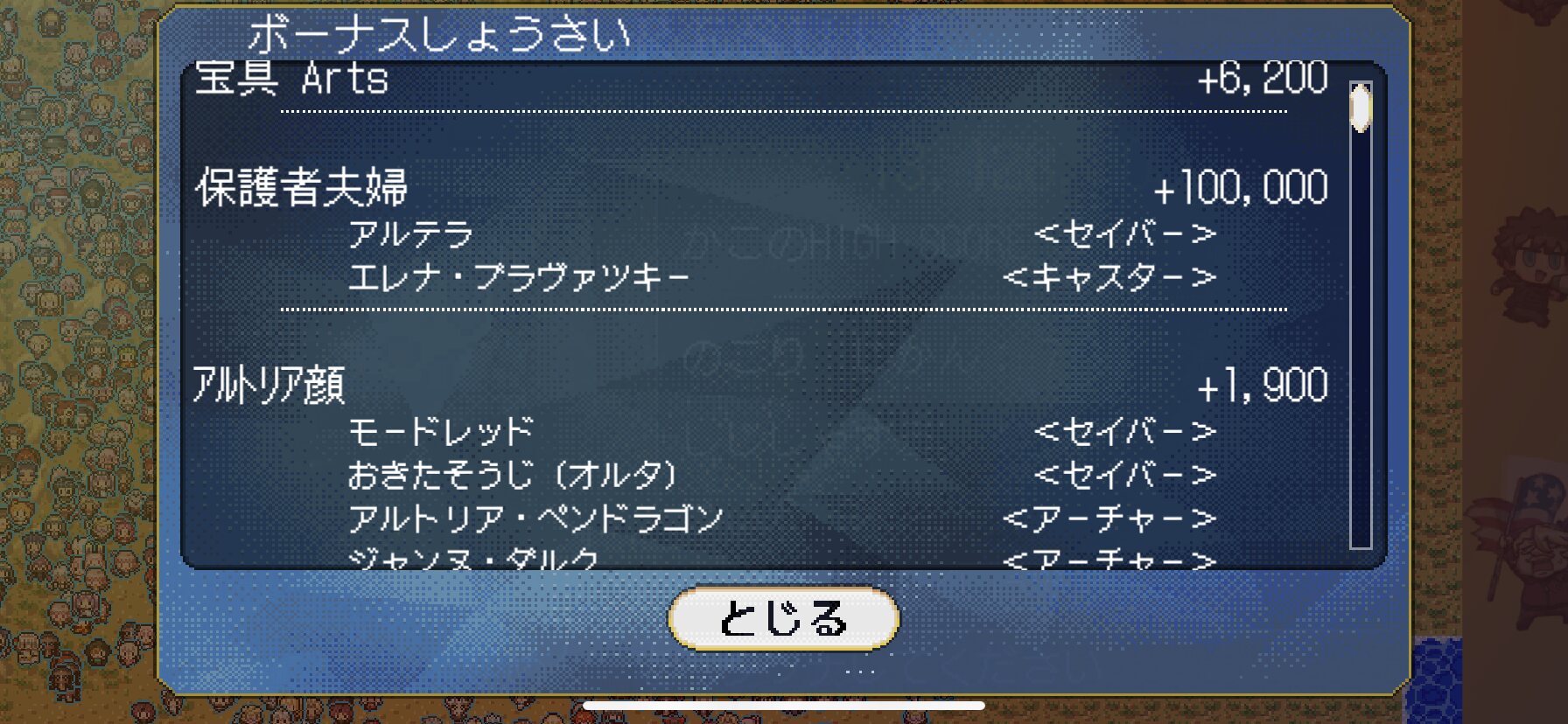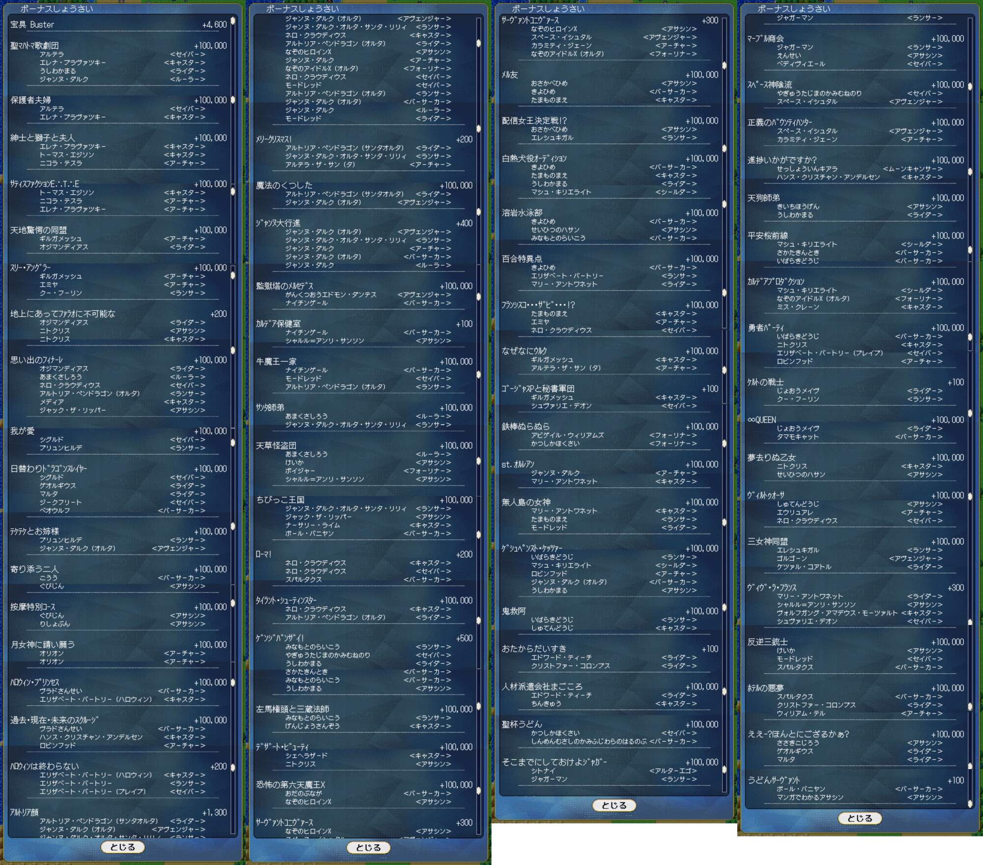 過去のイベント由来のボーナスは今後変化ないから全員揃って10万点貰えるけど、アルトリア顔とか今後新規鯖が実装した時に対象が広がる可能性のあるボーナスは全員揃っていても10万点ボーナスが得られないよう区別されてるのね