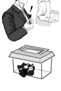 幸いにも検診は何事もなく終わった。問題が起きたのは待合室でのことだった。会計を待っていると、突然胸のちみがけたたましく鳴き喚く。そして待合室にいた少年の持っている虫かごに飛びついた。野良ちみを保護したらしく、見覚えのある成体ちみと他の野良ちみが団子になっている。驚いてる少年に私は弁明した。