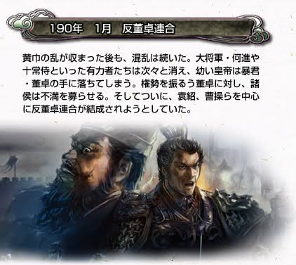 まず黄巾賊討伐隊が後に三国志と呼ばれる三国の皇帝およびその親族と次章のボス董卓が連合を組むのは出来過ぎを超えた出来過ぎなんだよね