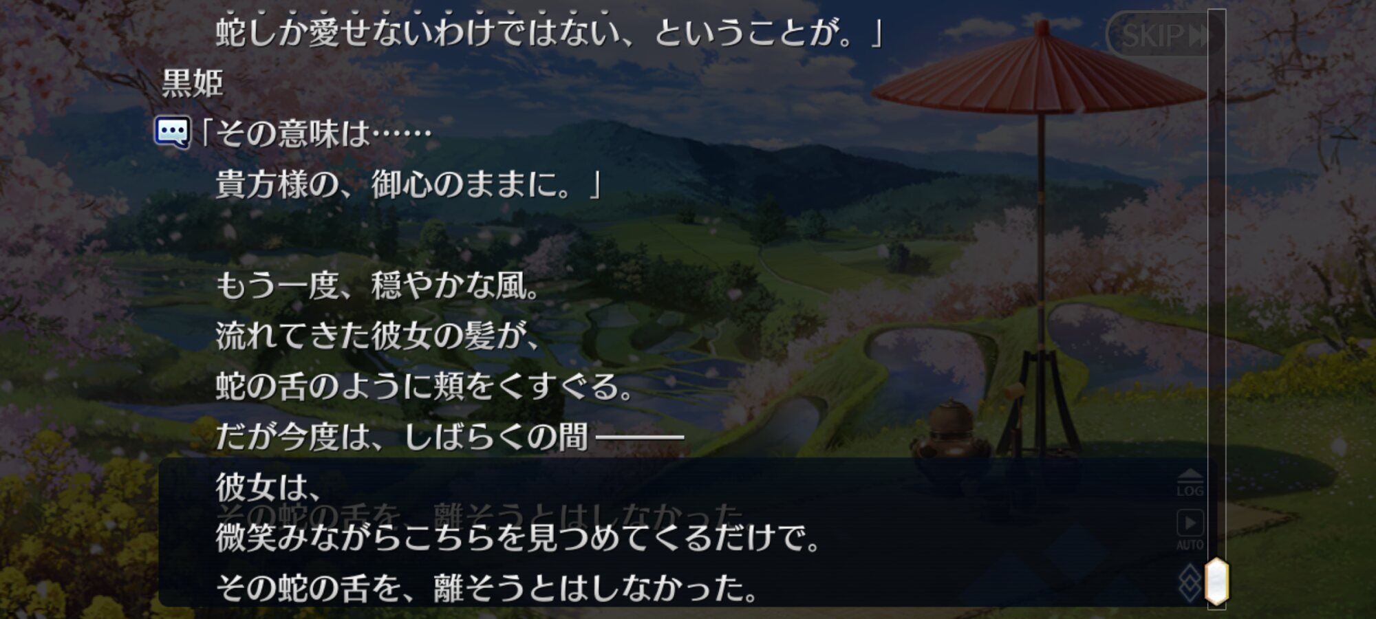 「蛇が好き」という前提やマイルームボイス、イベントストーリーで油断していたところのバレンタインで「私は蛇を愛する者ですが蛇しか愛せないわけではないのです」と言いながらチョコと一緒に髪渡してきて髪がぐだの頬を撫ぜる距離にいるっていうのが火力高すぎて戦慄されてたな