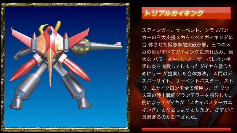単純計算で通常のガイキングの40倍に及ぶ炎のエネルギーを発揮する事になり、もは やその威力は測定できる物ではない。発動時は全身が赤熱化し、まさに究極の炎の巨人となる。」