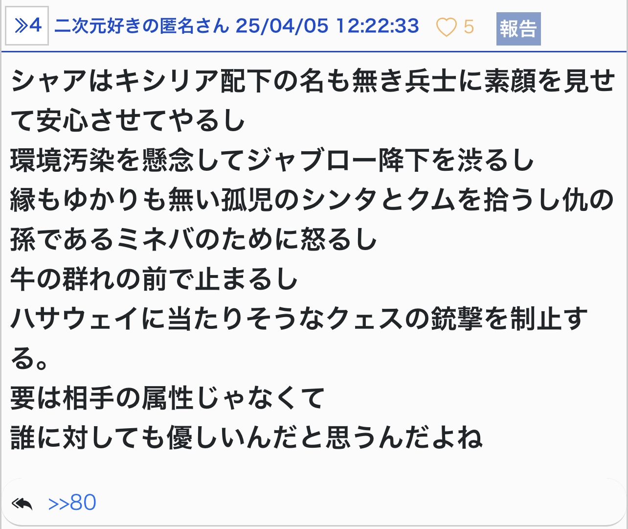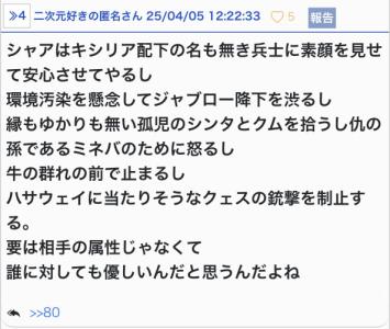 色んなジャンルカテ見てるけど、どこもこういうのは同じだなぁ - 157二次元好きの匿名さん25/05/31(土) 16:08:38